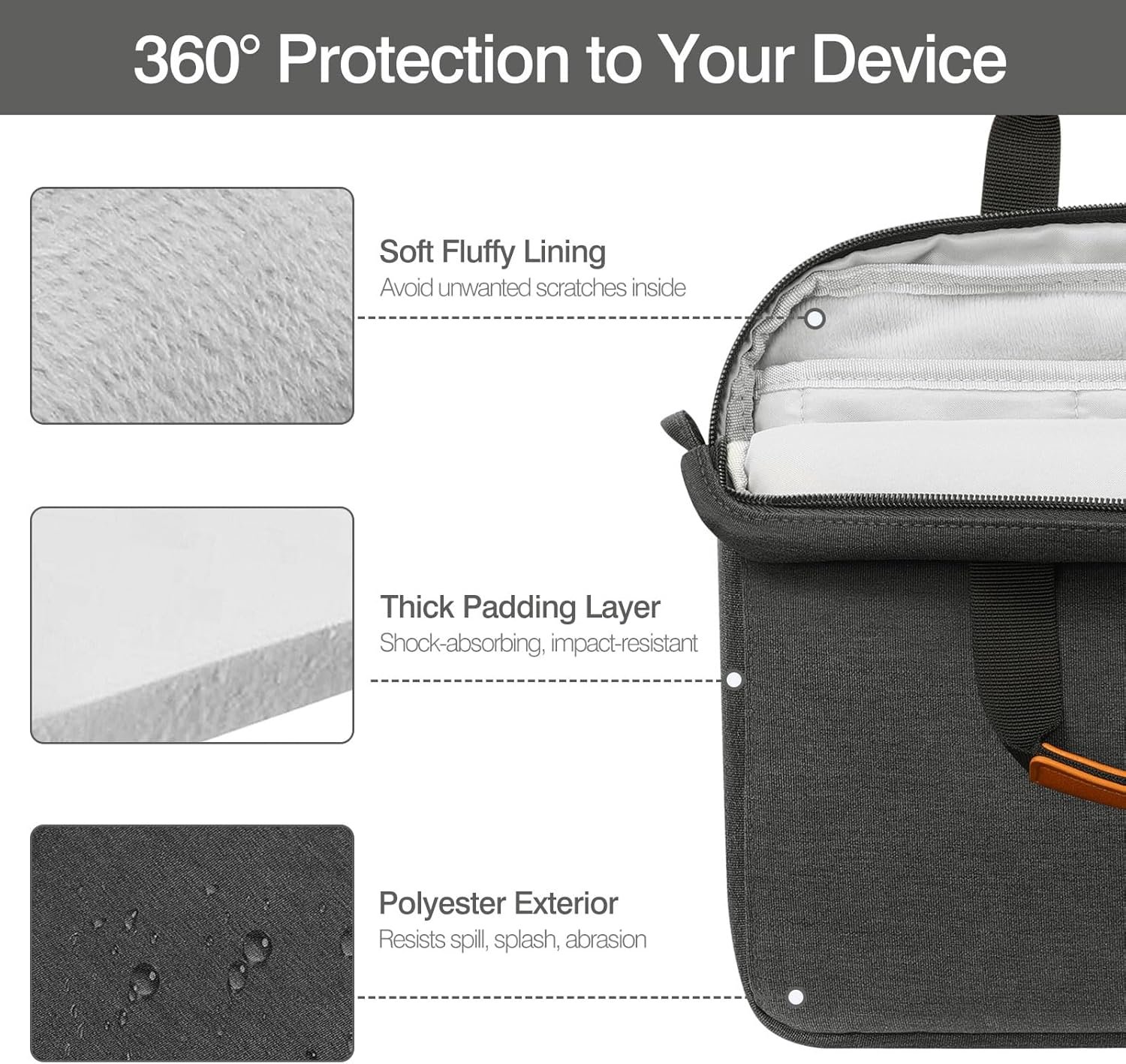 【Water-Resistant Material】- Durable polyester exterior protects the device against daily splashes and spills. Soft lining interior fully wraps the sleeve against shocks and scratches.