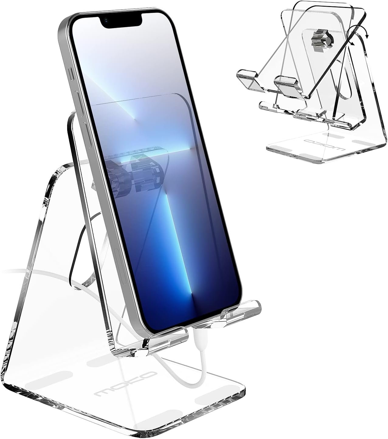 MoKo Acrylic Tablet Stand, Adjustable Angle Phone Stand for Desk, Fit with iPhone 17/17 Air/17 Pro/17 Pro Max, iPhone 16/Pro/Pro Max/Plus, iPhone 15/Pro/Pro Max/Plus, iPhone 14/Pro/Pro Max/Plus, Clear