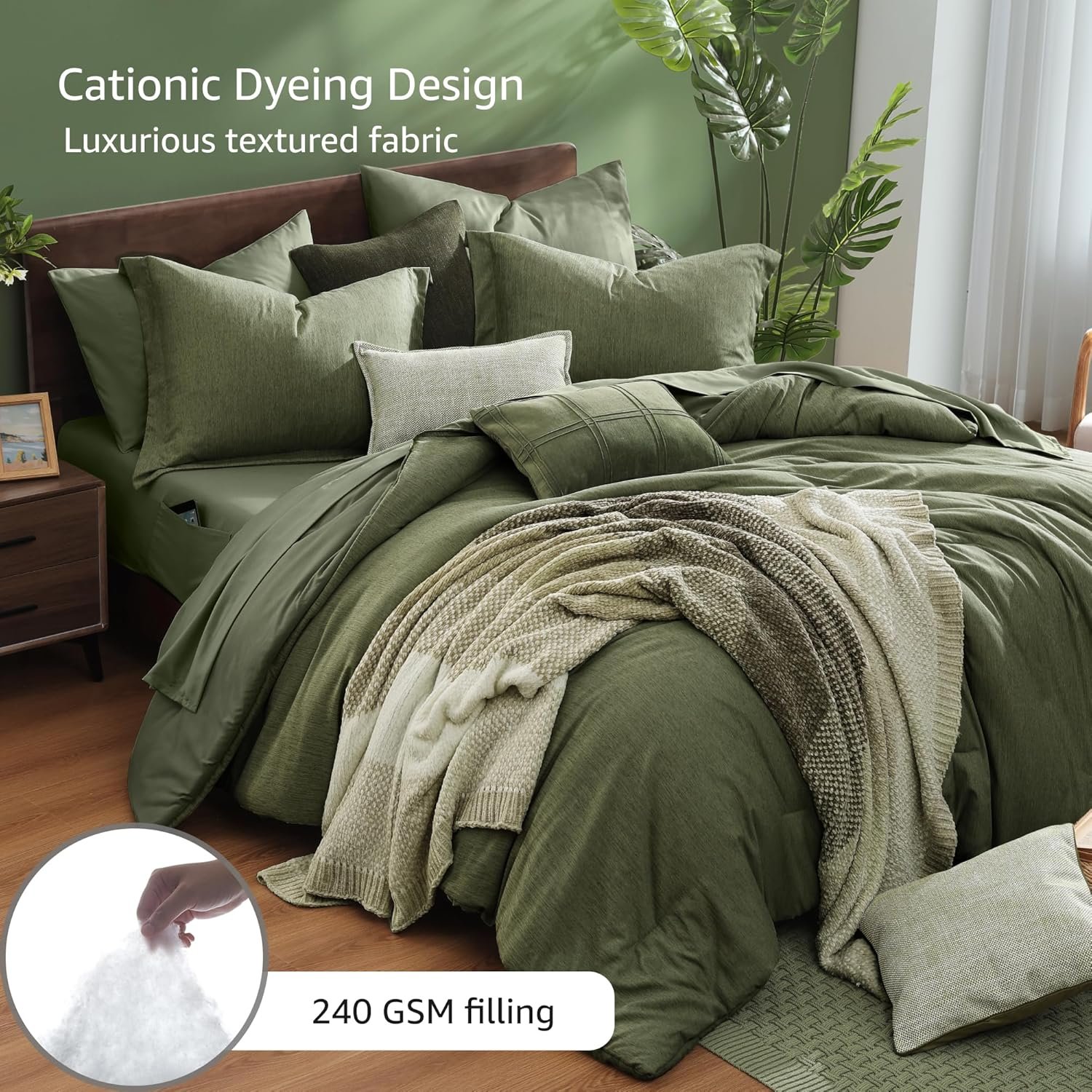 Monbix Queen Comforter Set – 7 Pieces Cationic Dyeing Olive Green Bed in a Bag Queen Bedding Sets with Comforter, Sheets, Pillowcases & Shams, Reversible Bedding Comforters Sets