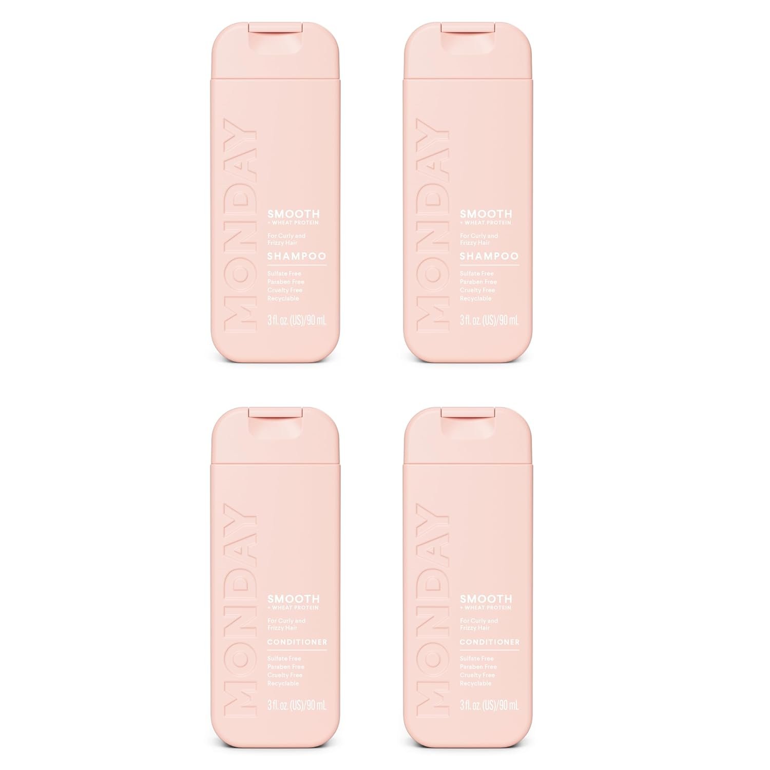 MONDAY Haircare Travel-Size SMOOTH Shampoo and Conditioner set for women is ideal for frizzy and unmanageable hair and curly and wavy hair types. This defrizzing Shampoo and Conditioner helps to soften and smooth hair with Coconut Oil, Shea Butter and Vitamin E—ingredients that help support hair health and maintain normal hair growth and thickness. Bottles are fully recyclable and these salon-quality Shampoo and Conditioner formulas are dermatologically tested, PH-balanced, and free from SLS, parabens and phthalates.