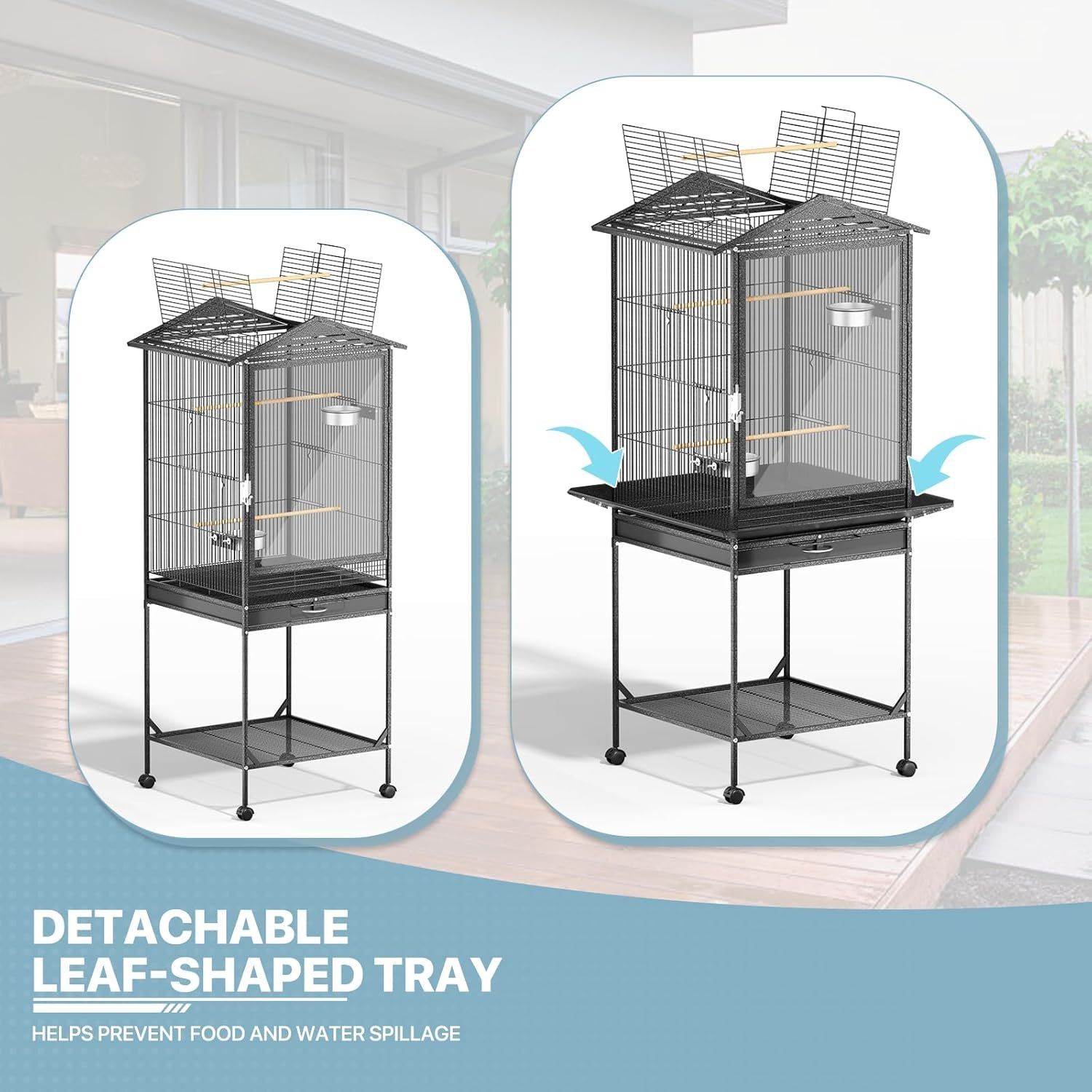 Detachable Leaf-Shaped Tray & Effortless Maintenance – Keep your bird cage clean with our detachable leaf-shaped tray that prevents food and water spillage. Additionally, a slide-out tray and grille make cleaning effortless, ensuring a fresh environment and clean floors.