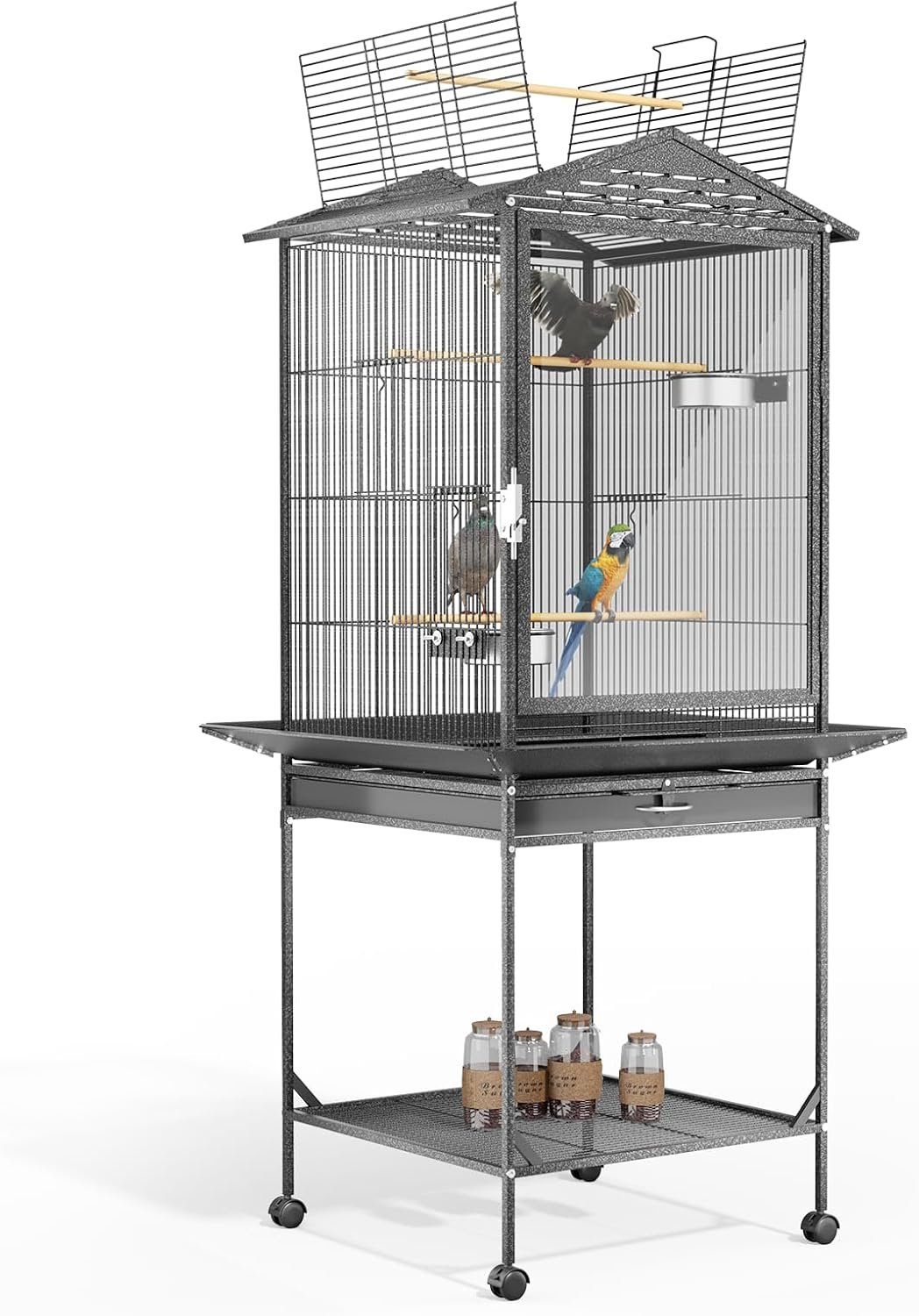 MoNiBloom 54 Inch Bird Cage w/Acrylic Door, Open Top Roof Birdcage for Finches Canaries Lovebirds Medium Small Parrots, Flight Birdcage w/Rolling Stand, Black