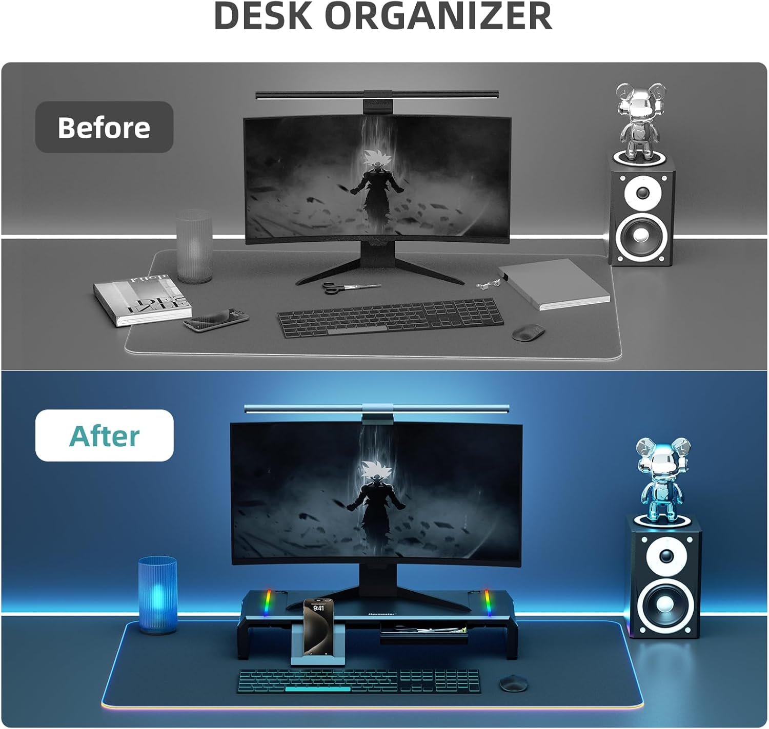 ✅【6 RGB MEMORY LIGHTING】The computer monitor riser is the only one stand with the RGB lighting memory function, so that you do not need to adjust the lighting each time. The RGB decorative lights can be switched between 6 colorful effects by just pressing a button, it can provide you with an immersive gaming atmosphere experience.