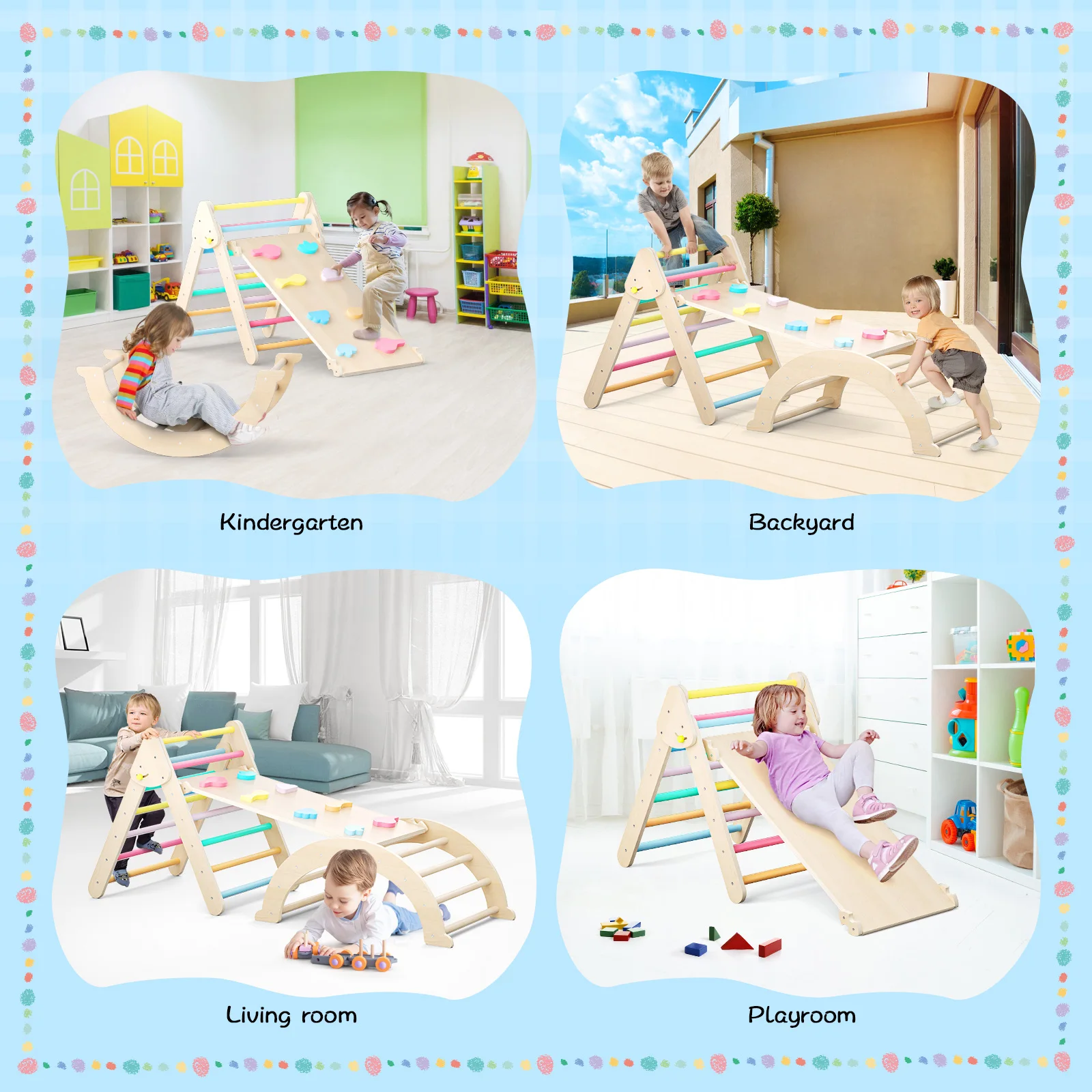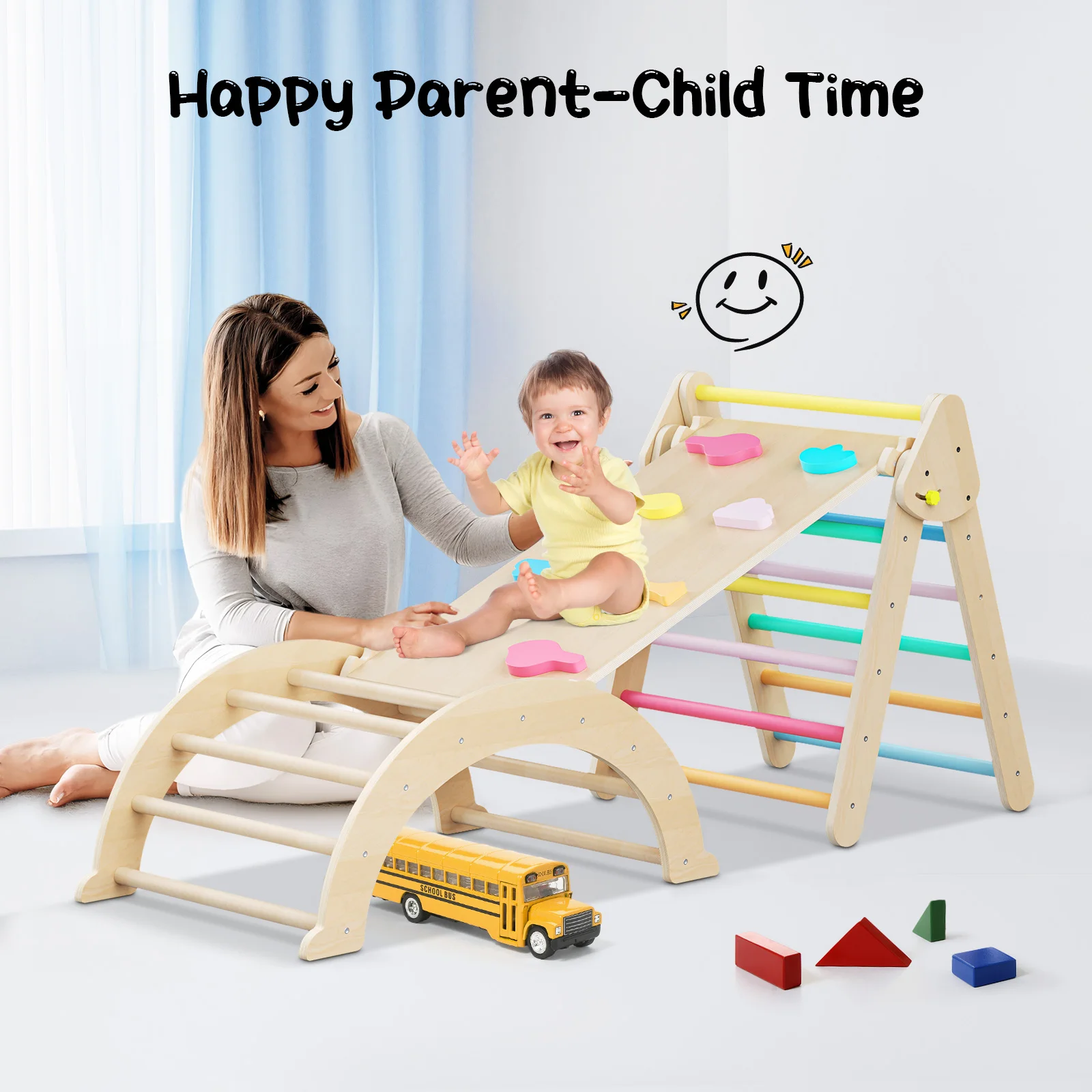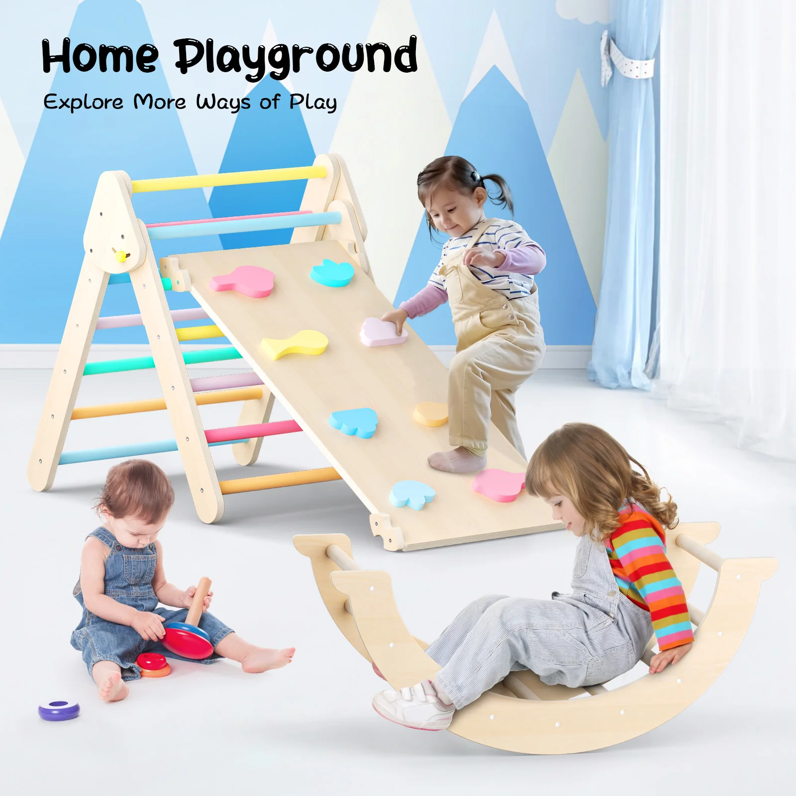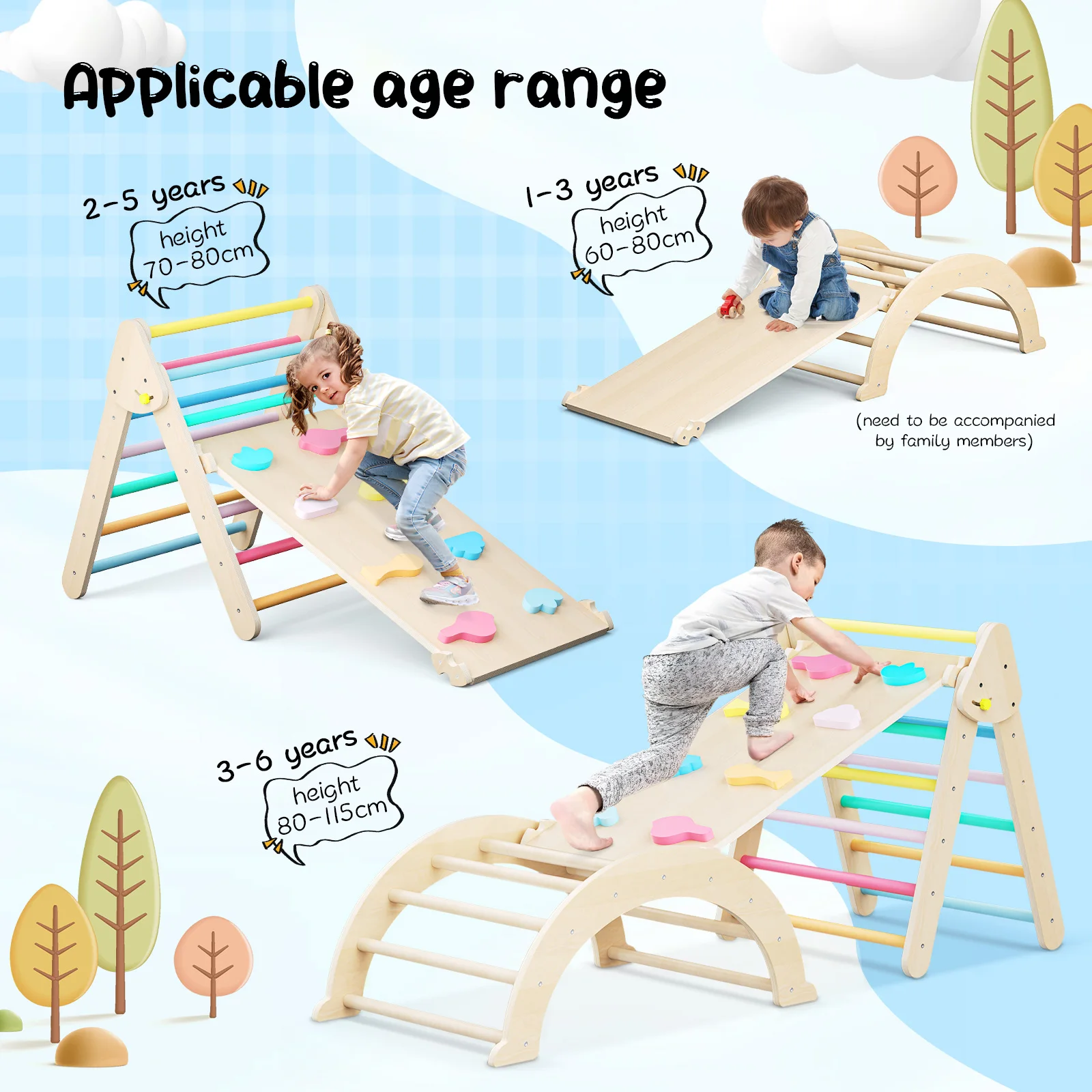 The rainbow colors of the climbing frame and board are more visually appealing, capturing children’s attention and reducing screen time. They enhance playtime fun and help improve color recognition. Suitable for kids aged 1-6, these toys are perfect for both indoor and outdoor play.
