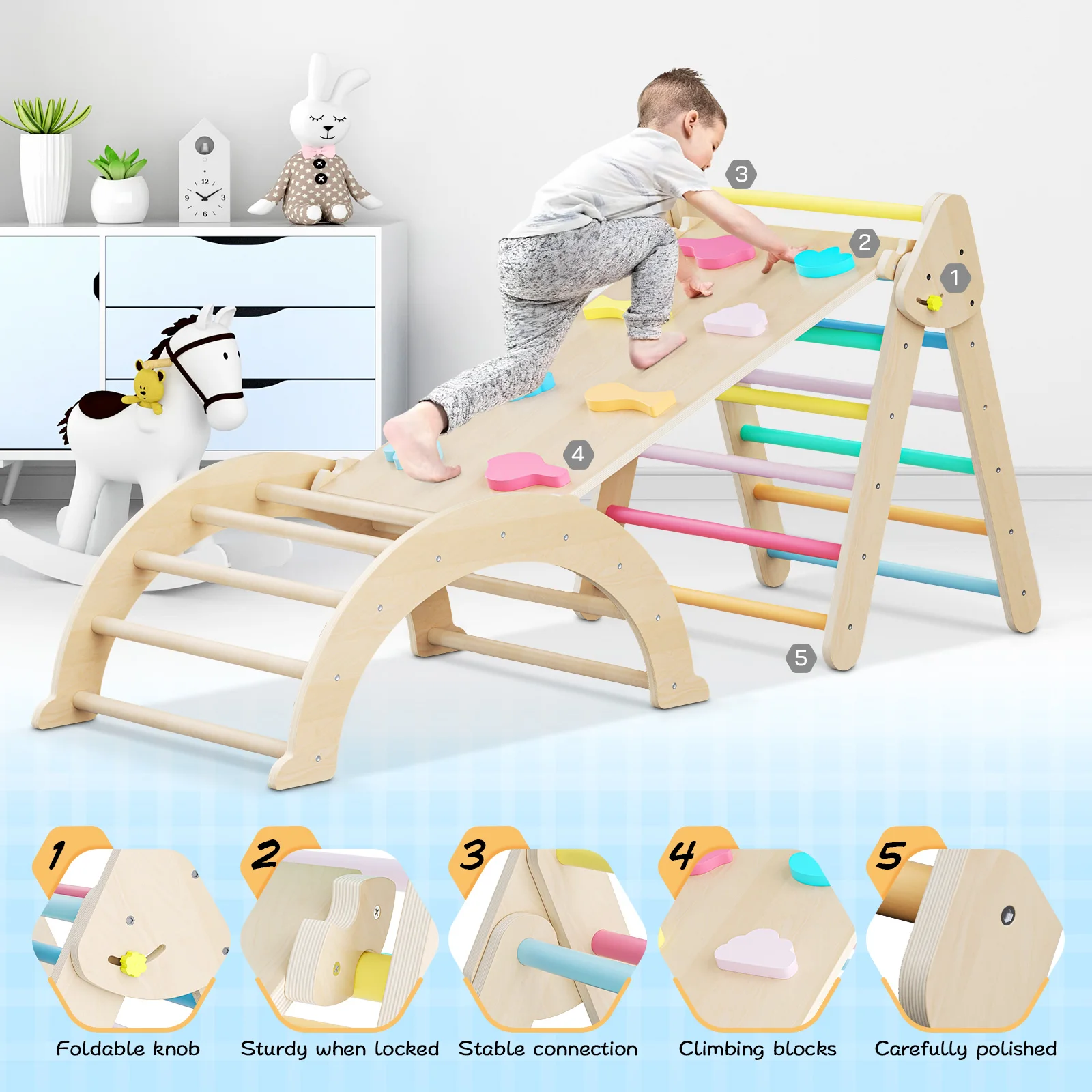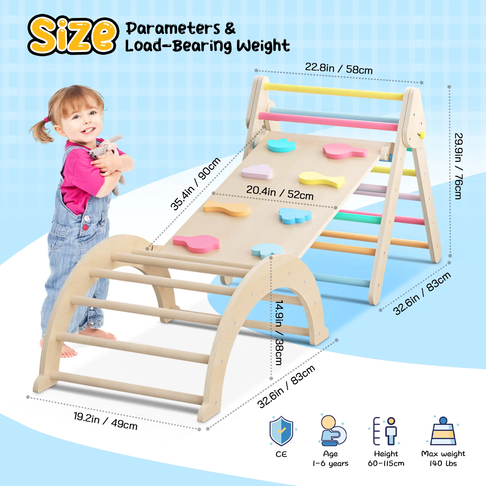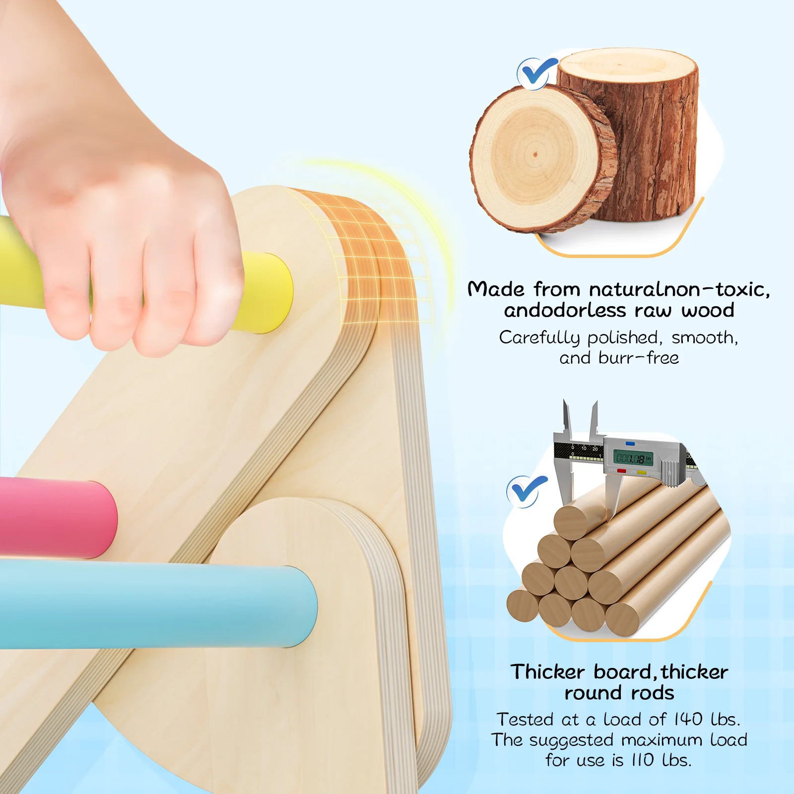The toddler climbing toys indoor boasts a sturdy triangular design with securely fastened joints, ensuring excellent stability. Plus, the thickened boards and round bars can withstand up to 140 pounds of weight.
