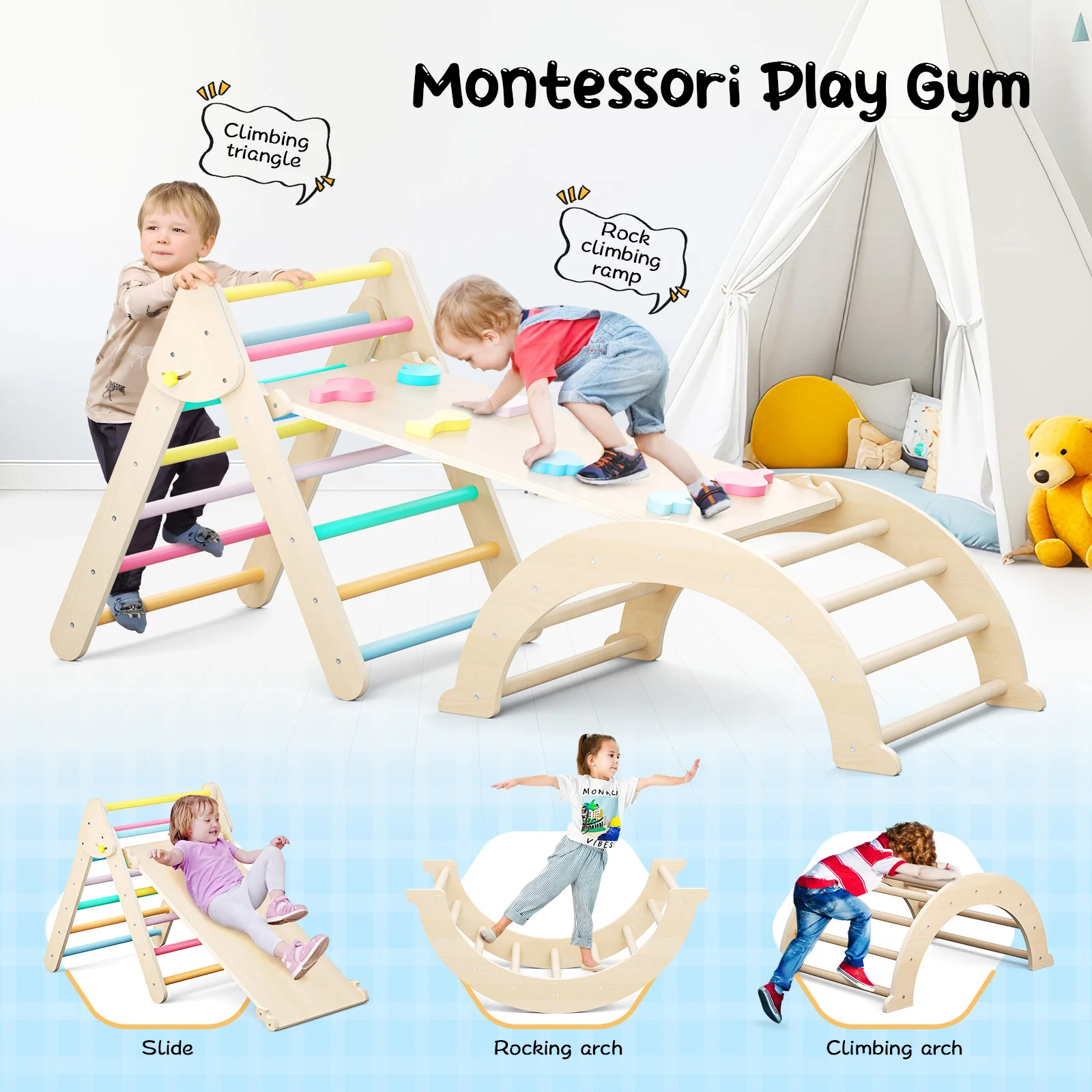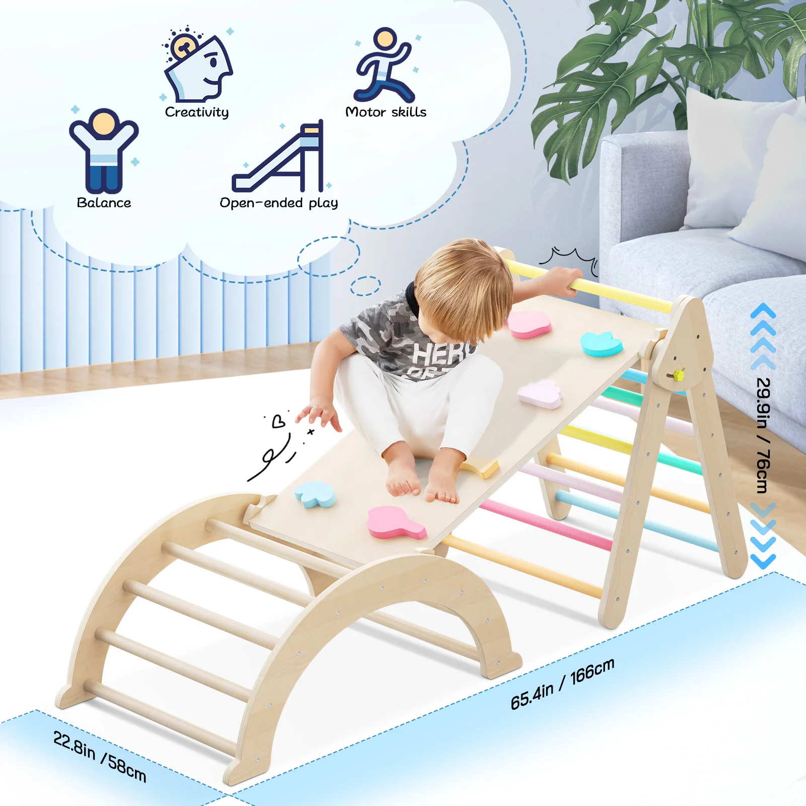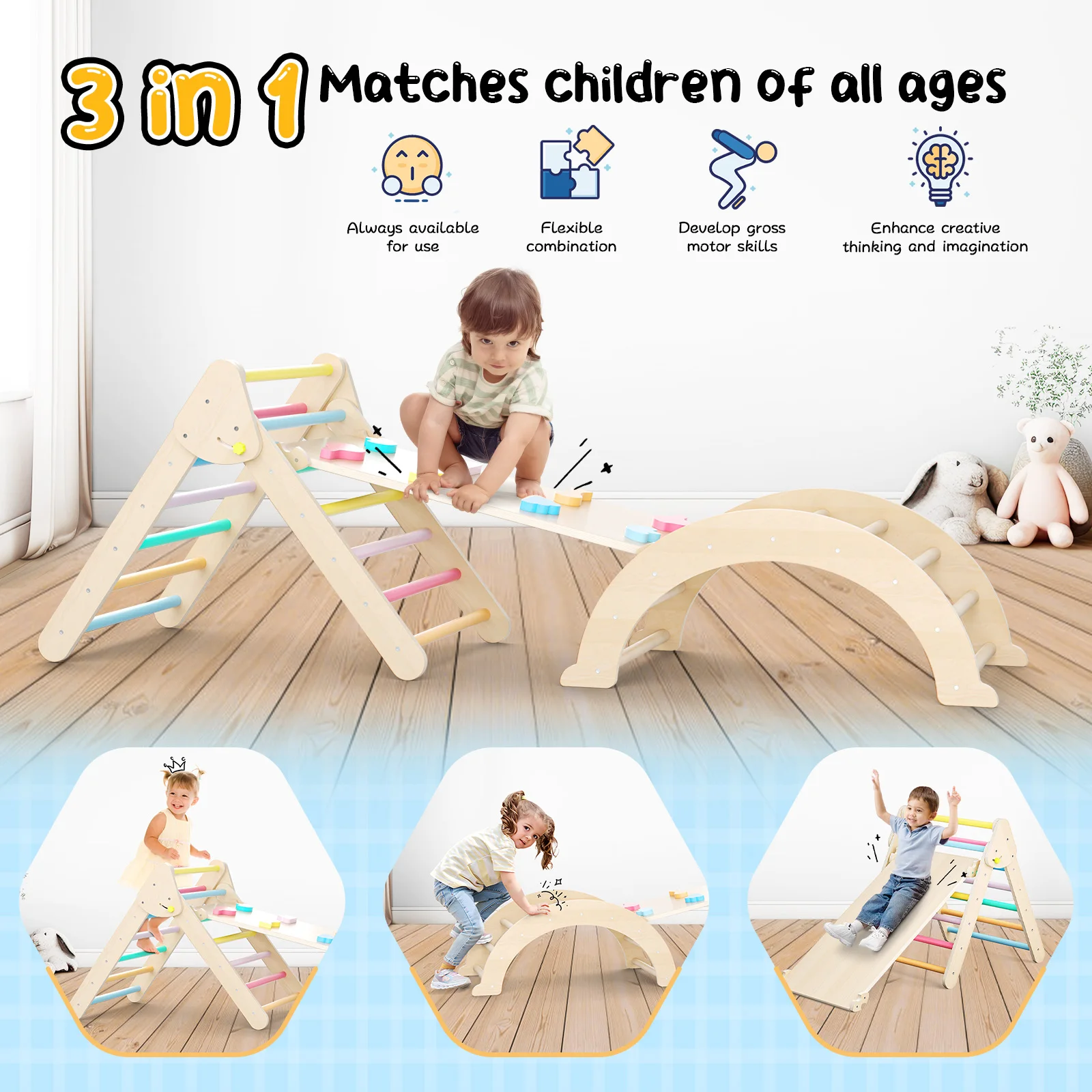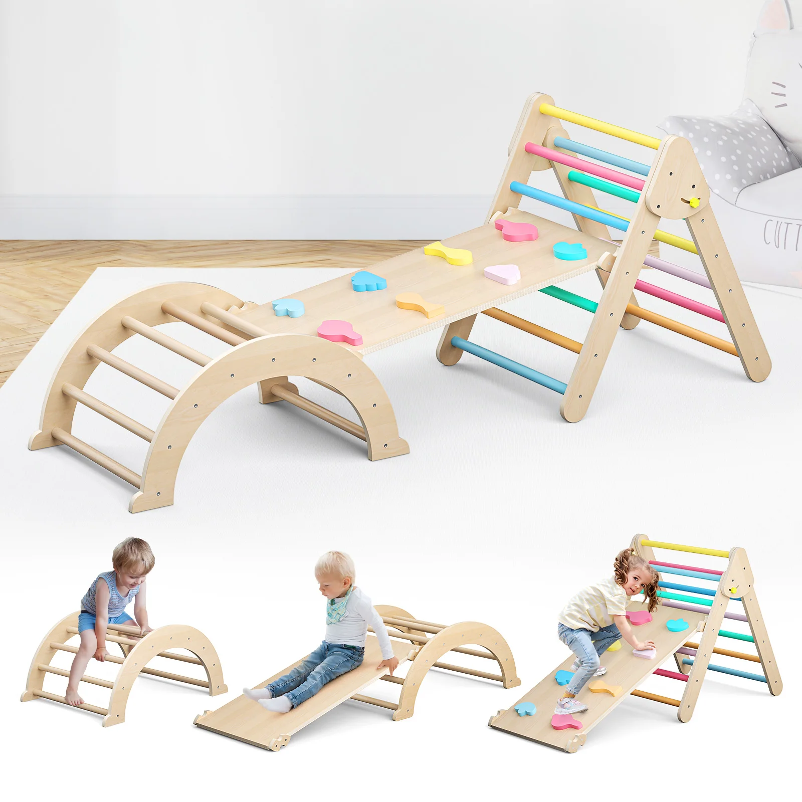 The toddler climbing toys are a versatile and fun addition to any play area, offering various climbing and balancing challenges for children. It includes a triangular climber, board and arch frame, promoting balance, creativity, open-ended play, and motor skills.