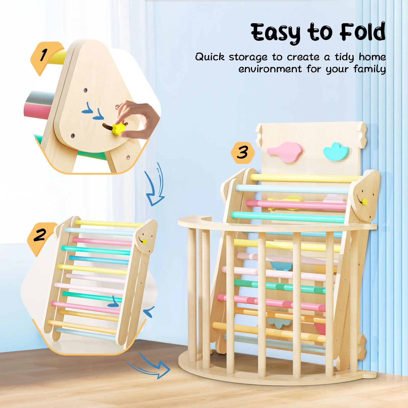 The triangle set features adjustable height, allowing you to modify the height between the board and ladder according to the child’s age, ensuring kids of all ages can have fun. Additionally, the triangular climbing ladder is foldable, making it easy to store and saving space.