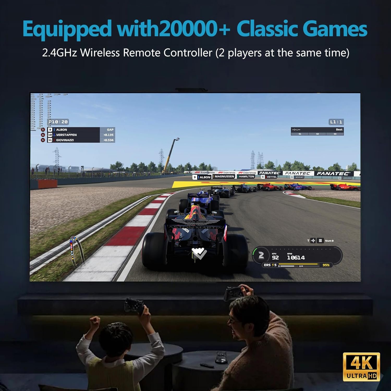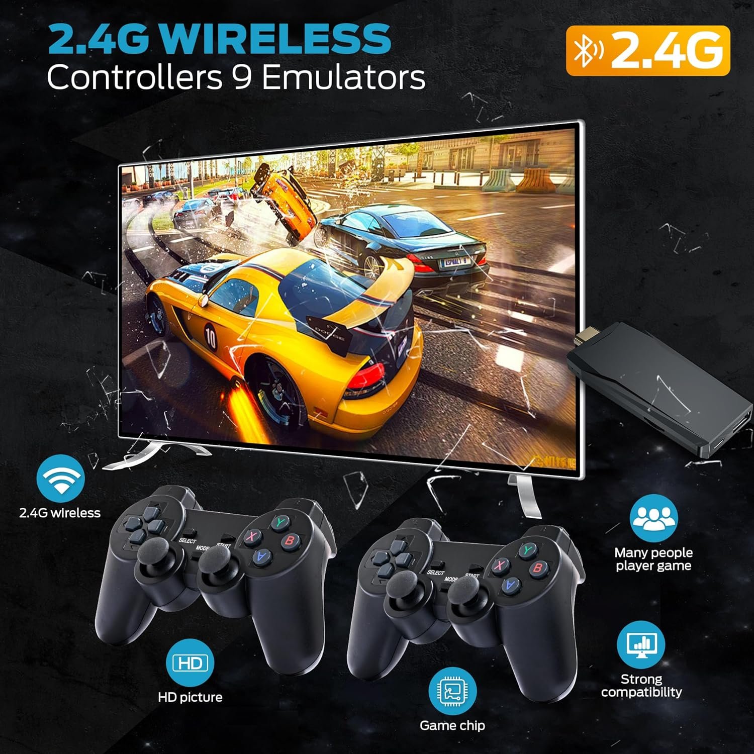 2.4G Wireless Controllers for Hassle-Free Gaming:Say goodbye to tangled cords! The console comes with dual 2.4GHz wireless controllers, offering seamless connectivity and precise control up to 10 meters away. Enjoy a smooth and immersive gaming experience without any interruptions.