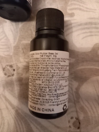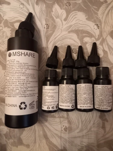 I received the parcel, it looks, everything is fine, white bottle top without adhesive layer, 250 ml, and 4 bottles: shiny hard top 30g, top without adhesive layer 30g, transparent raber base 30g, raber base color 30g.