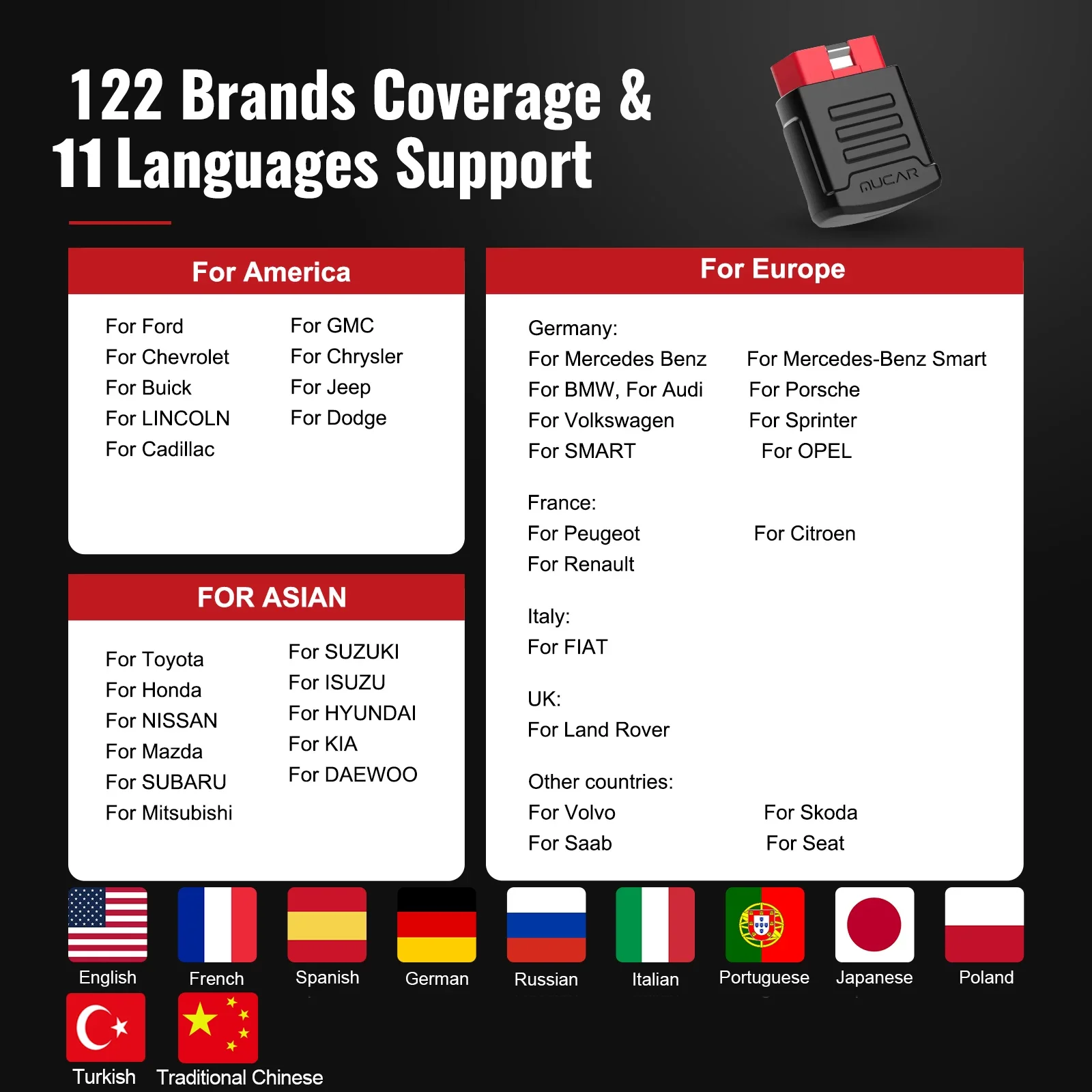 4) 【Support 120+ car Model】Works on 99% of vehicles covering Asian, European, American, Russian, Malaysia, India vehicles.