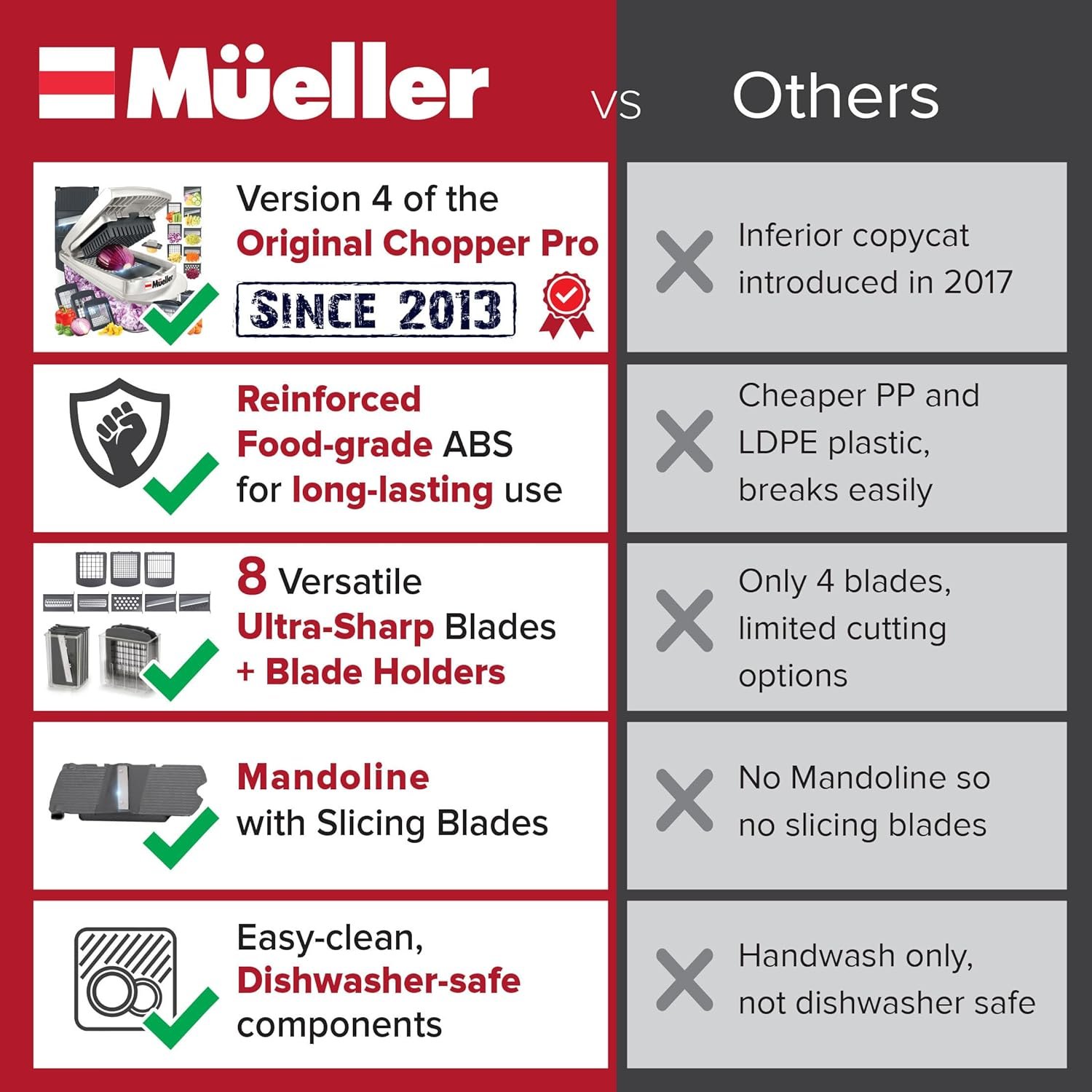 The Original Pro Chopper Refined Since 2013 – Another well marketed lower quality white/black model claims to be the original. More restaurants use Mueller than all the others combined because of our quality.. Effortlessly chop, slice, and dice your ingredients with ease using our tough as nails chopper. It’s simple to use, set up, and clean, saving you time and energy during meal preparation. Become a kitchen pro with this must-have kitchen tool.