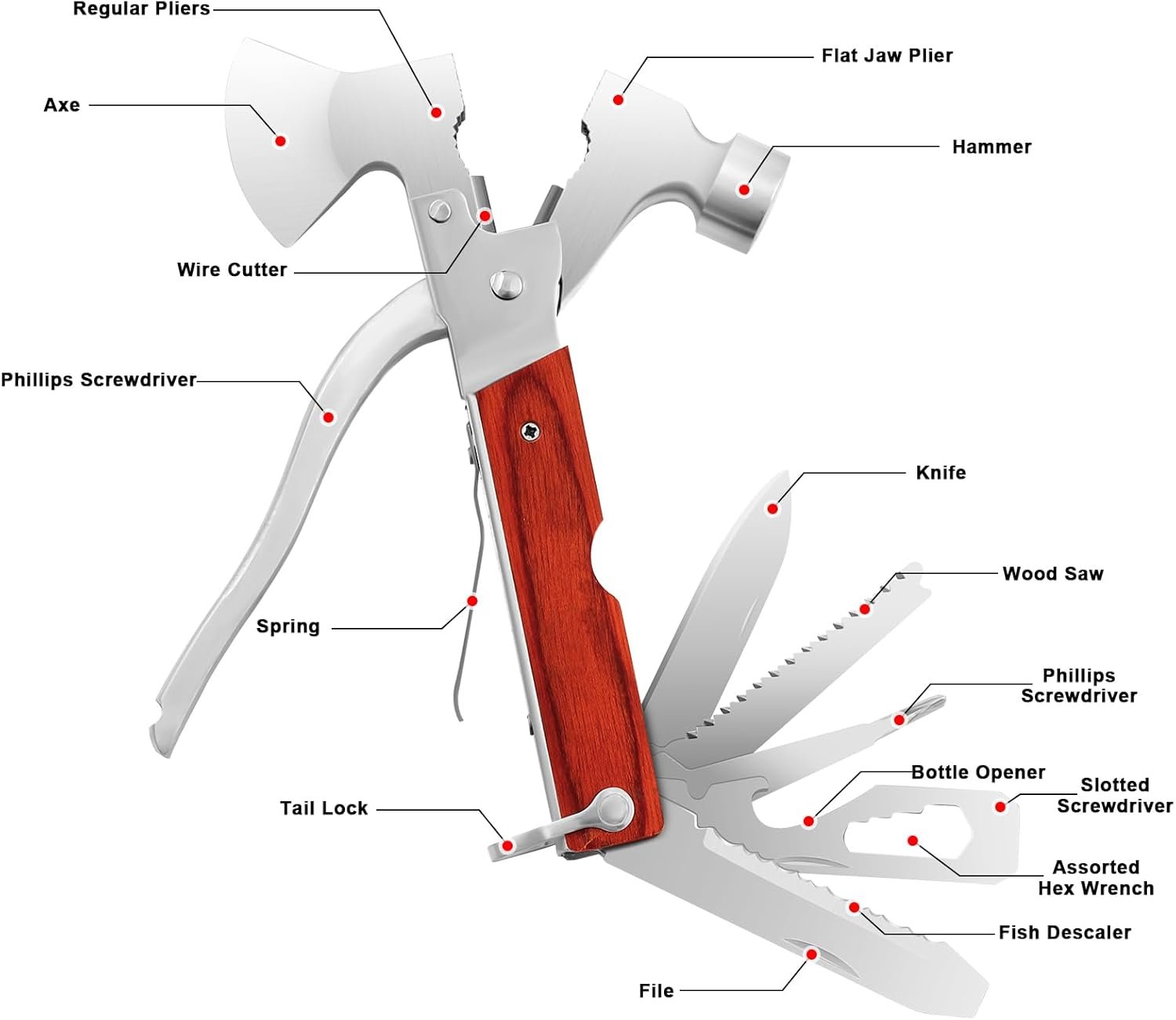 【16 functions in one】including hammer, grub screw, wire cutter, needle-nose pliers, vise, saw, bottle opener, Phillips screws, files, fish descaler, hex wrench, springs, handles, etc.