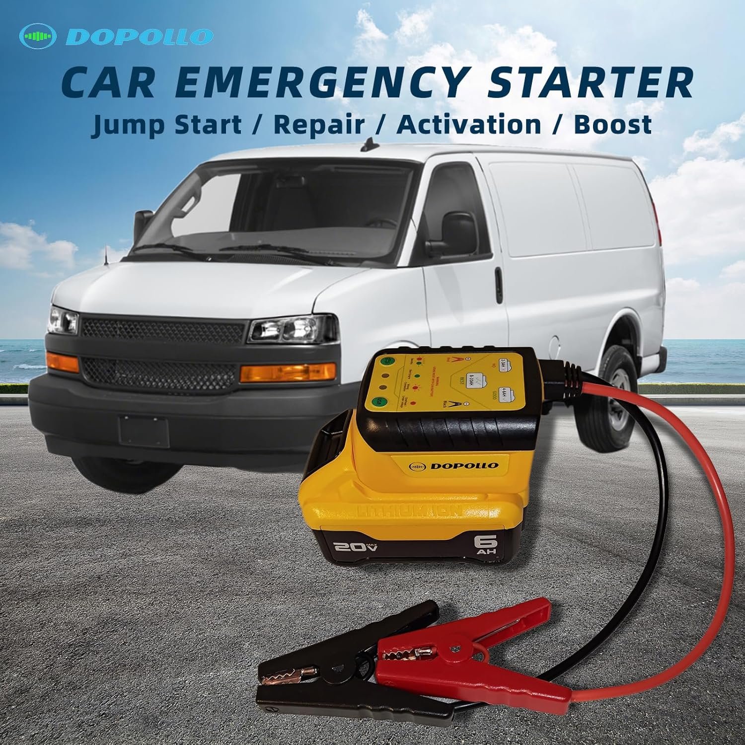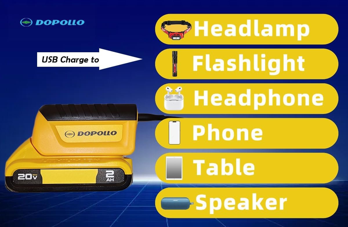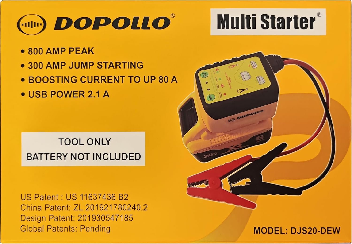 TOOL ONLY! Compatible with Dewalt 20V and 60V flex volt battery。 This adapter does not include a battery and must be used with DEWALT 20V or 60V lithium batteries。 Depending on the displacement of the car, you can use lithium batteries ranging from 6AH to 15AH to easily start a 6L gasoline car。 It can be used in various occasions, such as starting cars, lawn mowers, tractors, forklifts, and yachts。 It can be used both as a jump starter and a charger for your car battery。 Unique features can repair and activate car batteries that cannot be charged with a regular charger。 It can charge mobile devices such as phones, tablets, and Bluetooth speakers via USB interface。 Built-in multiple protection functions: Short-circuit protection: When the clamps are accidentally connected with the wrong polarity, this product will initiate protection, the red light will flash, and an alarm will sound。 Reverse connection protection: When connected incorrectly with the battery, this product will initiate protection, the red light will flash, and an alarm will sound。 Overheat protection: When this product overheats due to prolonged use, overheat protection will be initiated and the red light will turn on。 Undervoltage protection: When the tool battery voltage is too low, undervoltage protection will be initiated and the red light will turn on to avoid damaging your lithium battery。 Overvoltage protection: When using a battery exceeding the specified voltage, overvoltage protection will be initiated and the red light will turn on。 Overcurrent protection: To protect your lithium battery from damage due to overcurrent discharge, we have set 400A starting current and 1000A peak current protection, which is sufficient to start a 6.0L car within these safe currents。 This product is designed by an American company and has multiple international patents。 Note: This product is only for auxiliary car starting and cannot be used as a direct replacement for car batteries。 Note! This product is not suitable for the following vehicles: Cars using 24V batteries。 Cars with keyless start (only the charging function can be used)。