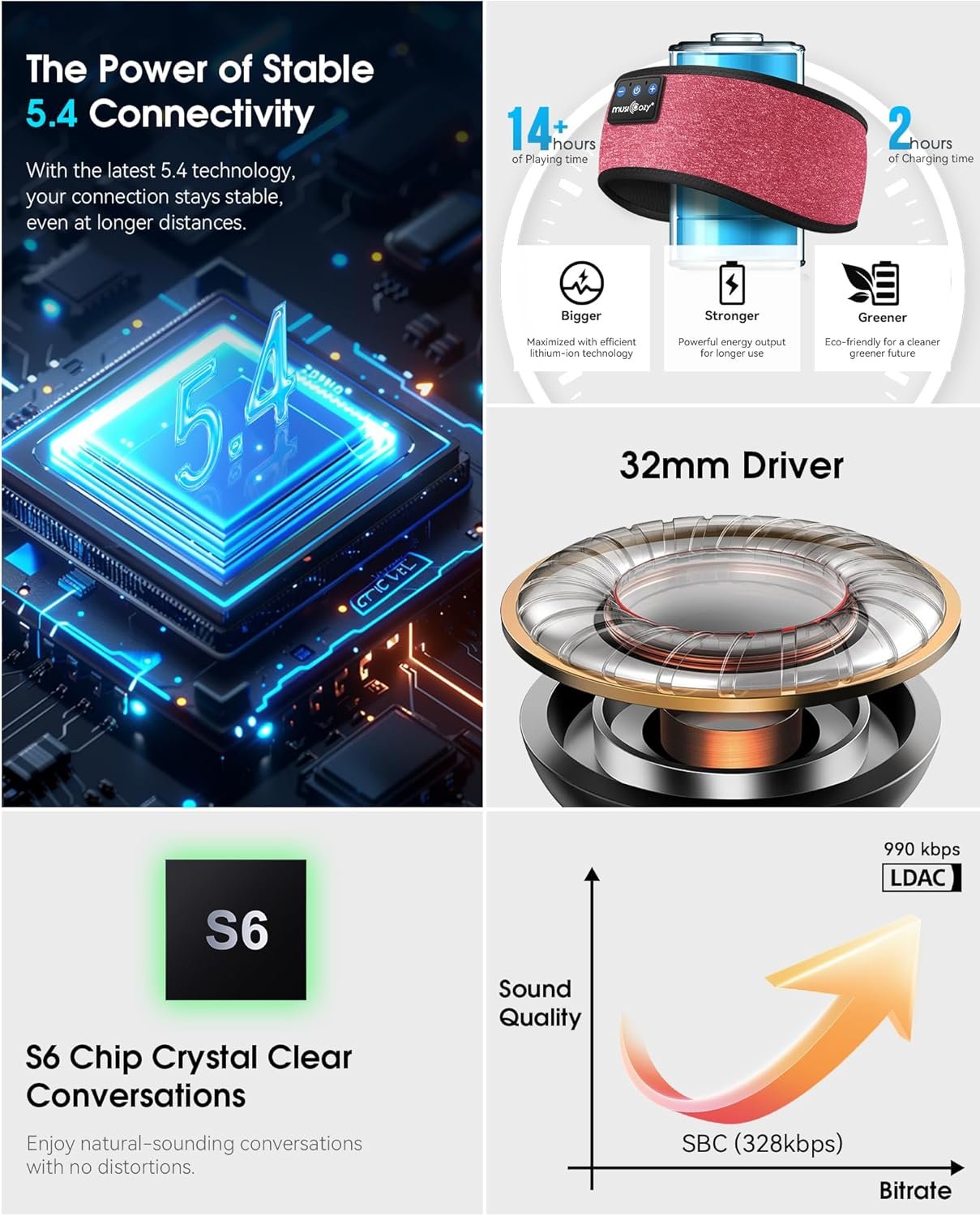 Next-Level Audio Experience – Experience the power of advanced 5.4 version headphones. MUSICOZY bluetooth headphones with 40mm composite drivers! The highly elastic silicone outer ring produces deep bass, while the lightweight and flexible biocellulose dome delivers mid and high range, and enhances clarity. Upgrade your listening game today!