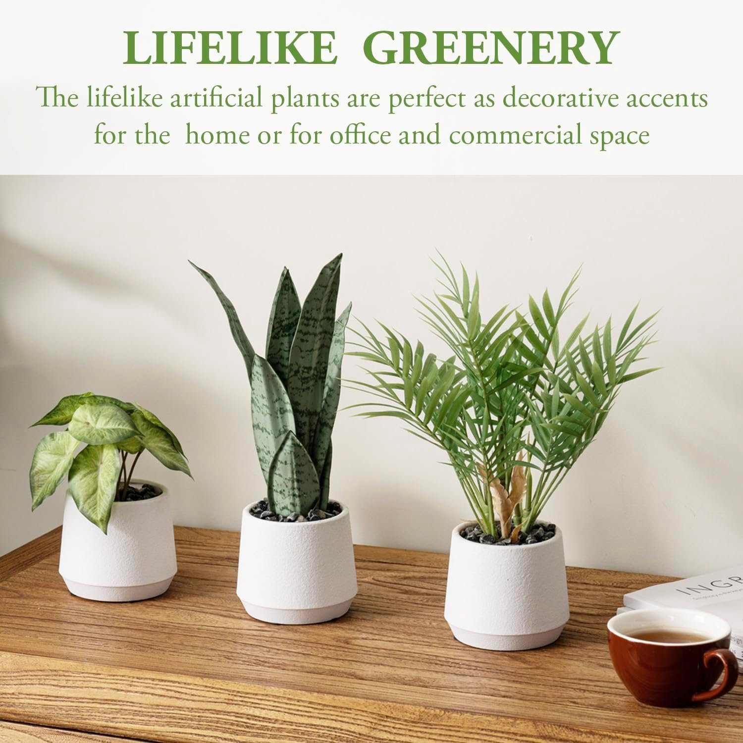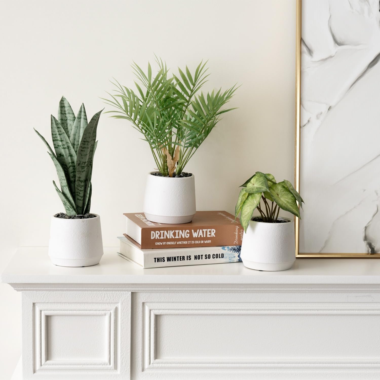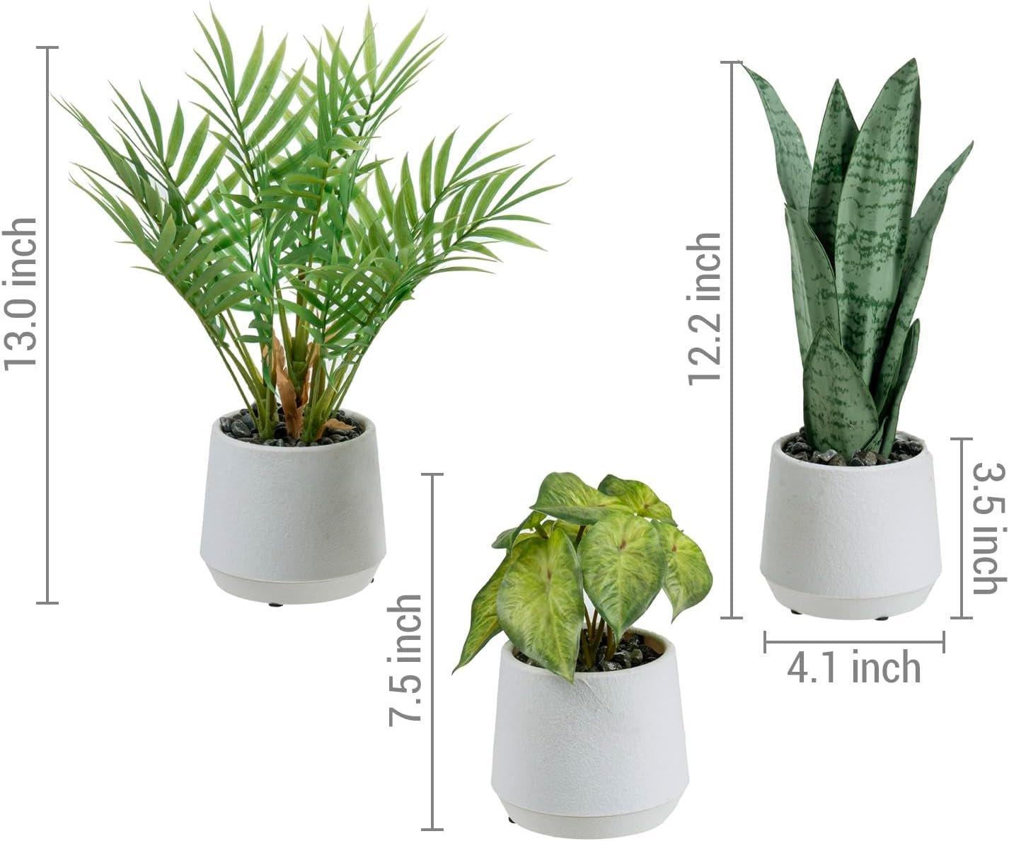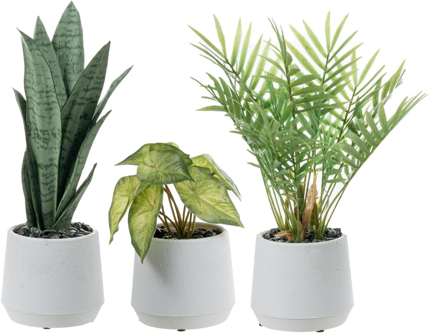 The trio includes realistic replicas of a 13-inch-tall chamaedorea elegans neanthe bella “parlor palm,” 7.5-inch-tall syngonium white butterfly “arrowhead vine,” and 12-inch tall sansevieria trifasciata hahnii silver jade marginata “snake plant,” for a diverse arrangement in a single location or placed separately for a stunning singular display.These high-quality plastic plants are potted with decorative gray stone pebbles in white planters for a modern minimalist aesthetic.Say goodbye to watering and sunlight concerns while enjoying the enduring vibrancy of these artificial plants. Whether you place them on a table, countertop, desk, or shelf, these hypoallergenic fake plants will add elegance and a touch of green to your surroundings.