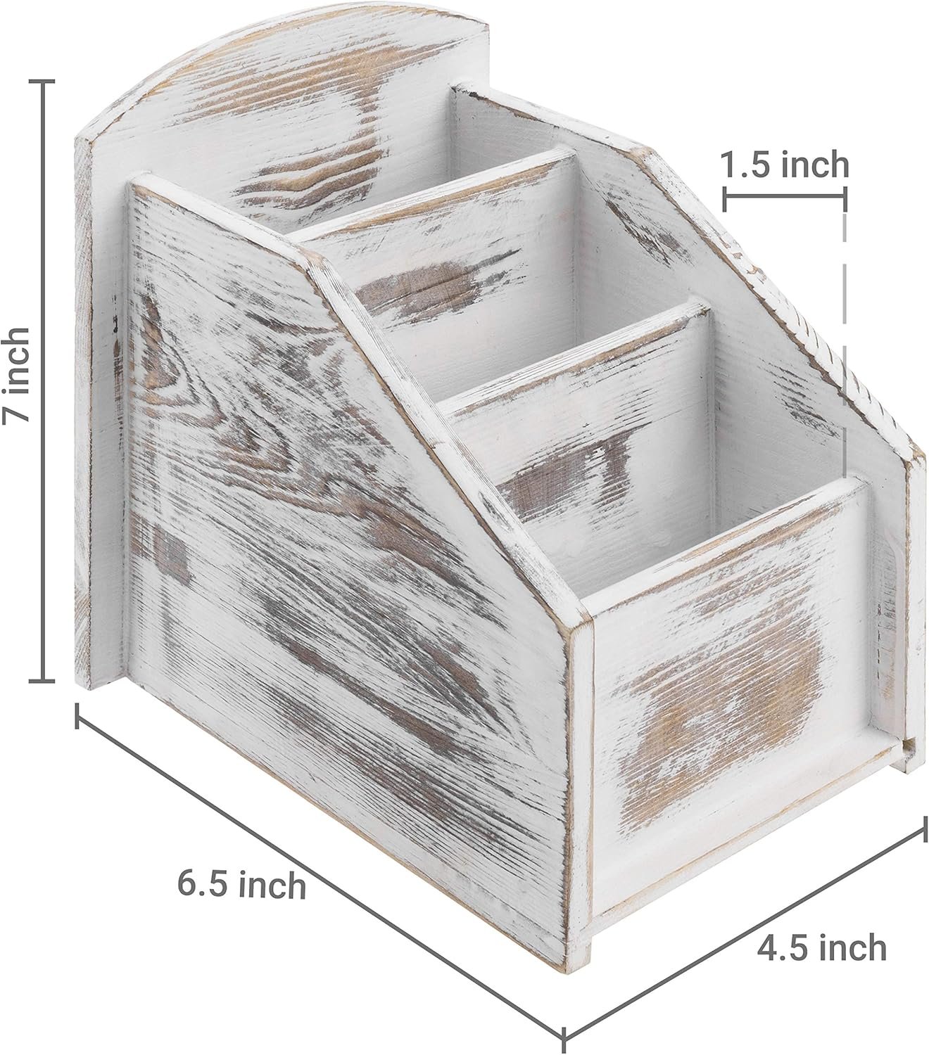 Featuring a stylishly weathered whitewashed finish to complement rustic and vintage decors, this wooden remote caddy offers an elegant way to keep media remotes or other items organized in the family spaces.
