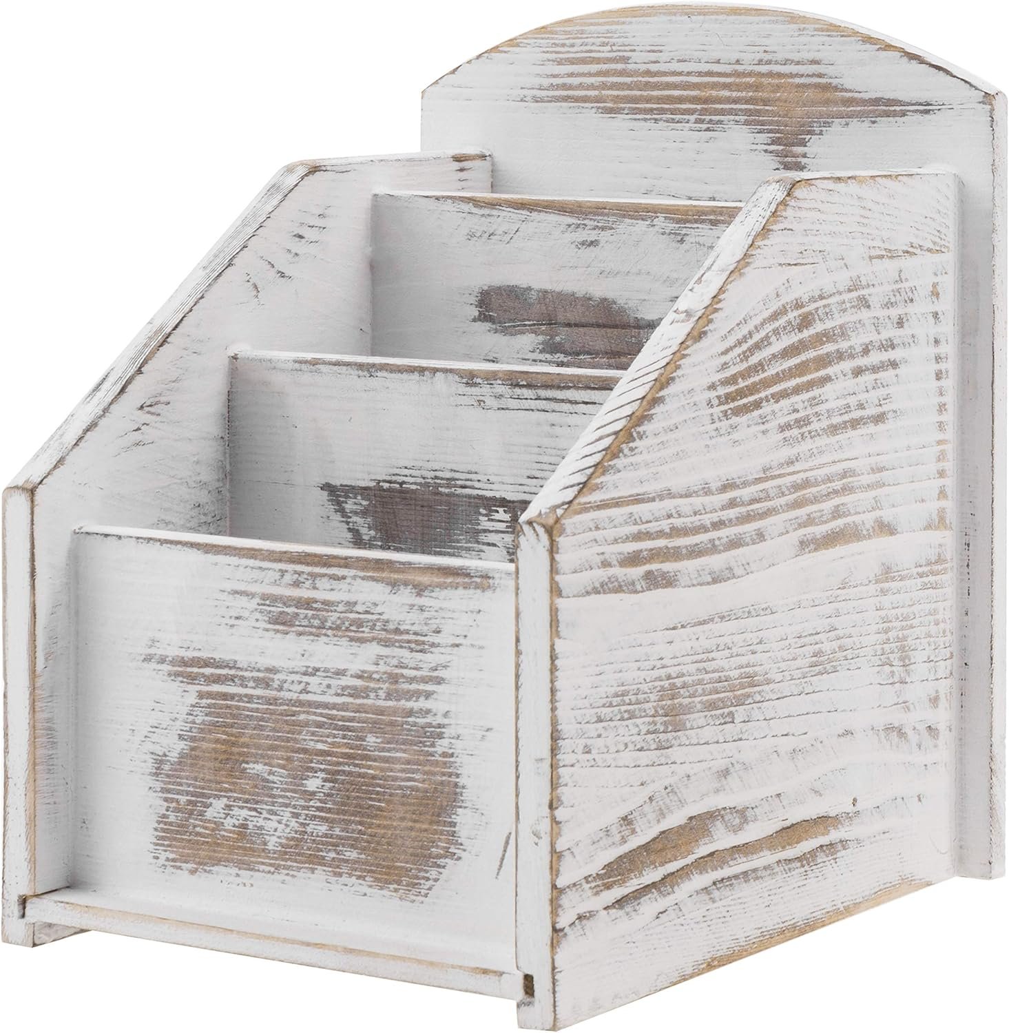 This wood storage rack features 3 compartments for storing media devices and office supplies. The small size takes up minimal desk or counter space and the angled design will hold items of various sizes, also can help you find remotes easily.