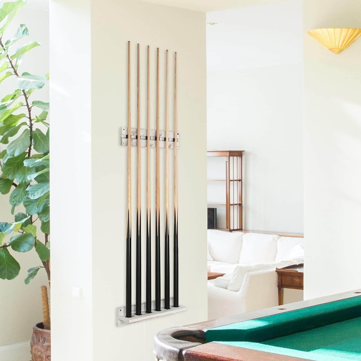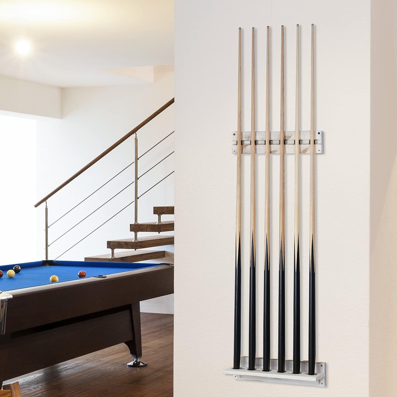 Wall mount rack can hold up to 6 cute sticks with durable clips and intended base, keeping each cue firmly in place