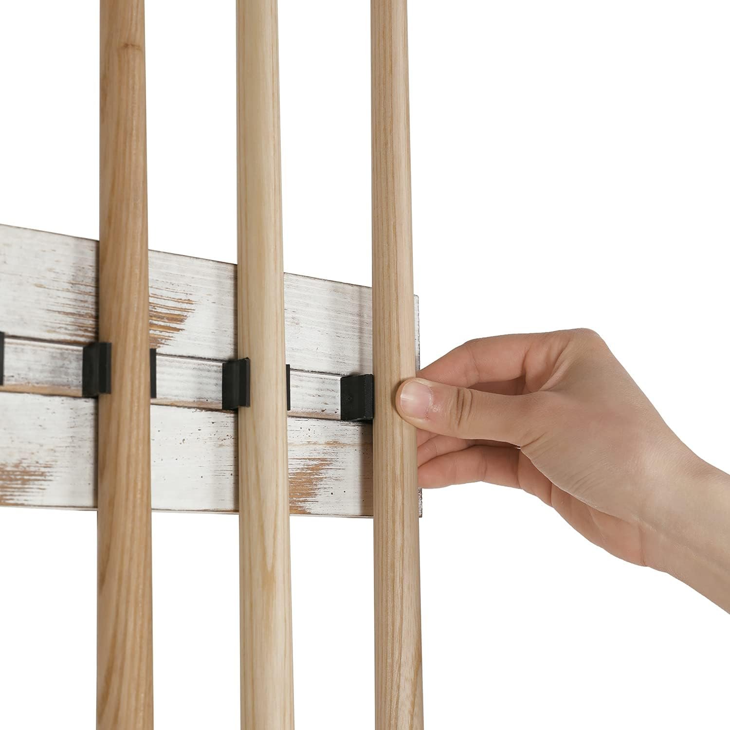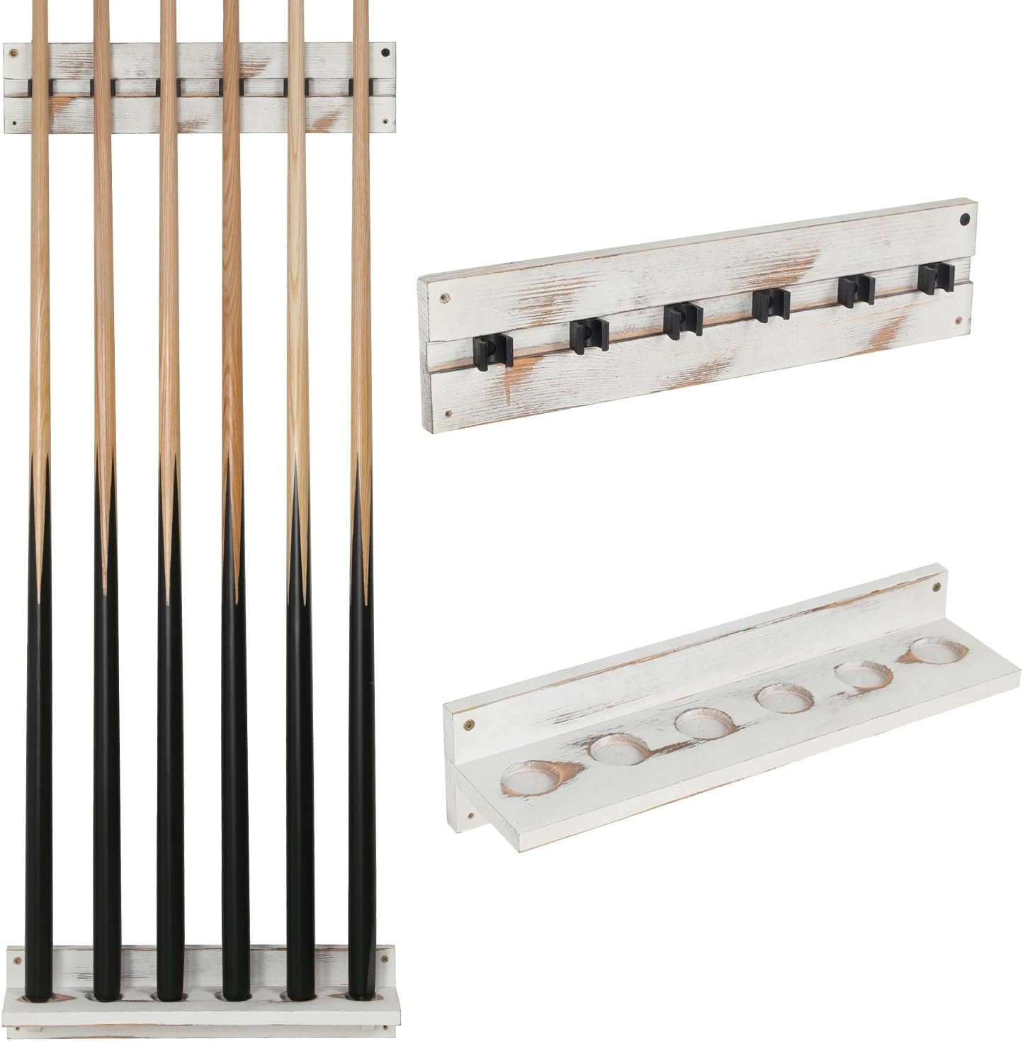 MyGift Vintage Whitewashed Wood Billiards Pool Stick Holder, Wall Mount Pool Cue Rack with Clips, Pool Table Organizer Accessories Set (Cue Rack Only), Holds up to 6 Cues