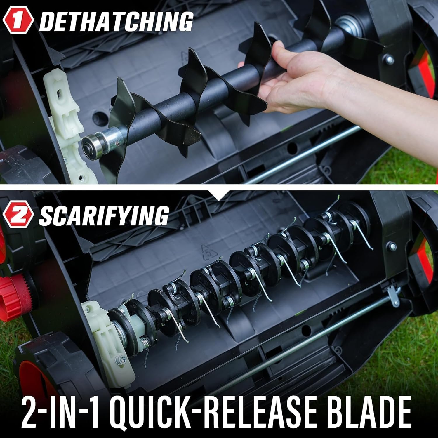 [Quick-Switch 2-in-1 Blades]:Use the dethatcher to clear thatch and moss or switch to scarifying to encourage deeper root growth and better soil health. This versatile tool offers flexibility for different lawn care needs.