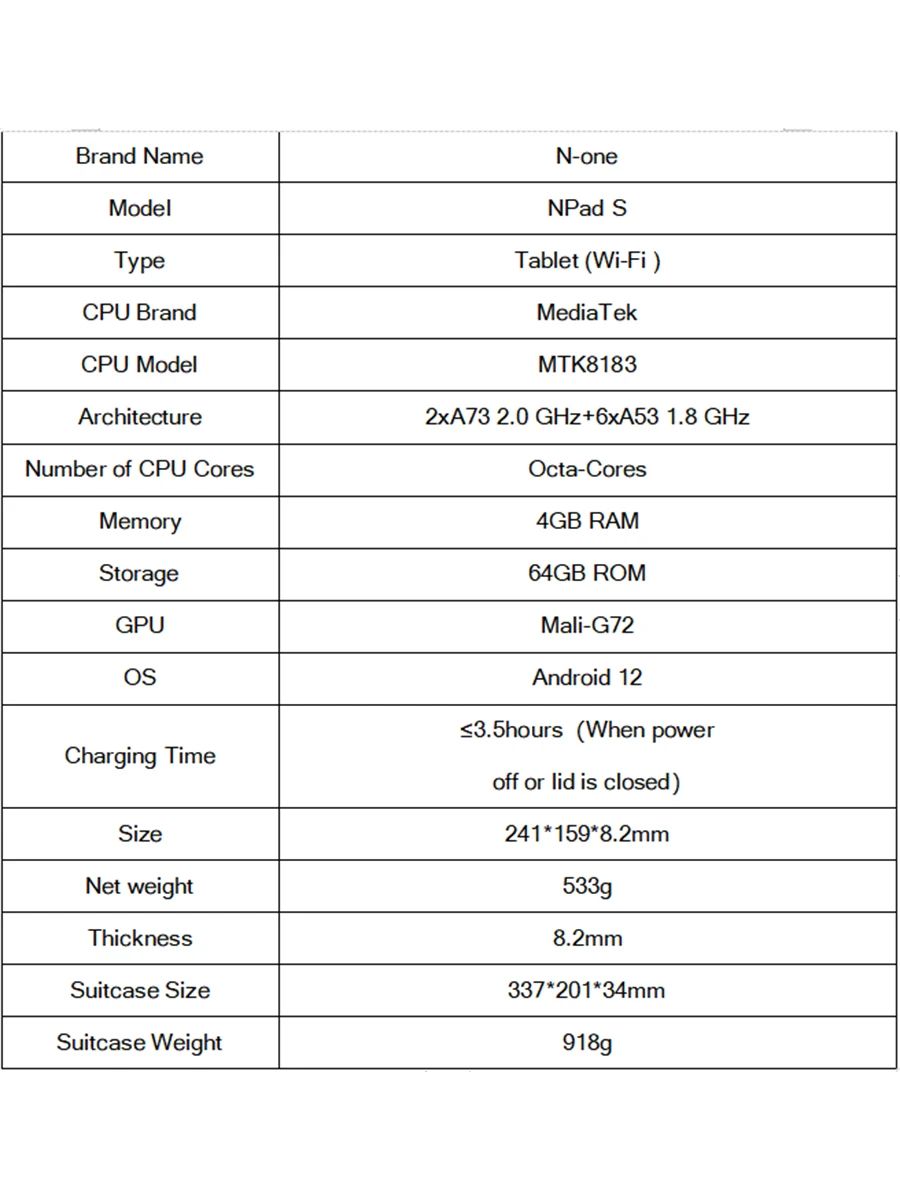 N-ONE NPad S 2023 10.1inch Tablet Pad 1280X800 HD 4GB 64GB Android 12 MTK8183 8-Cores 6600mAh Dual WIFI BT5.0 Tablettes