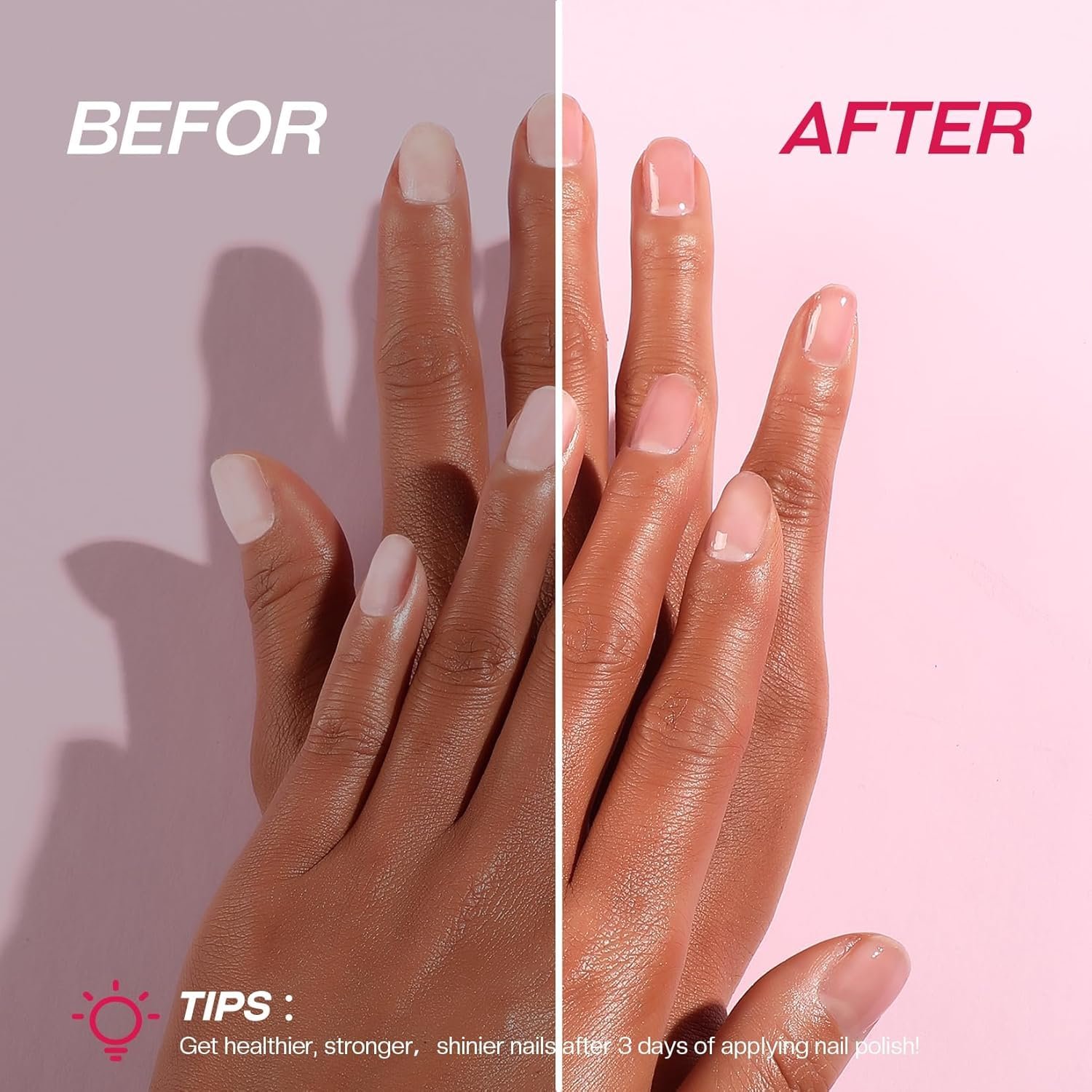 3-in-1 Nail Strengthener and Grower – As daily protection and repair of natural nails, treating weak, damaged, over-thinned, cracked natural nails and promoting nail grower. Nail strengthening polish is perfect to use as base coat before applying color to nail polish and color gel. At the same time, as a gloss can make the surface of the finger more shiny and full, save your time to select a variety of nail care accessories, protect and repair the nails while exuding glamor.