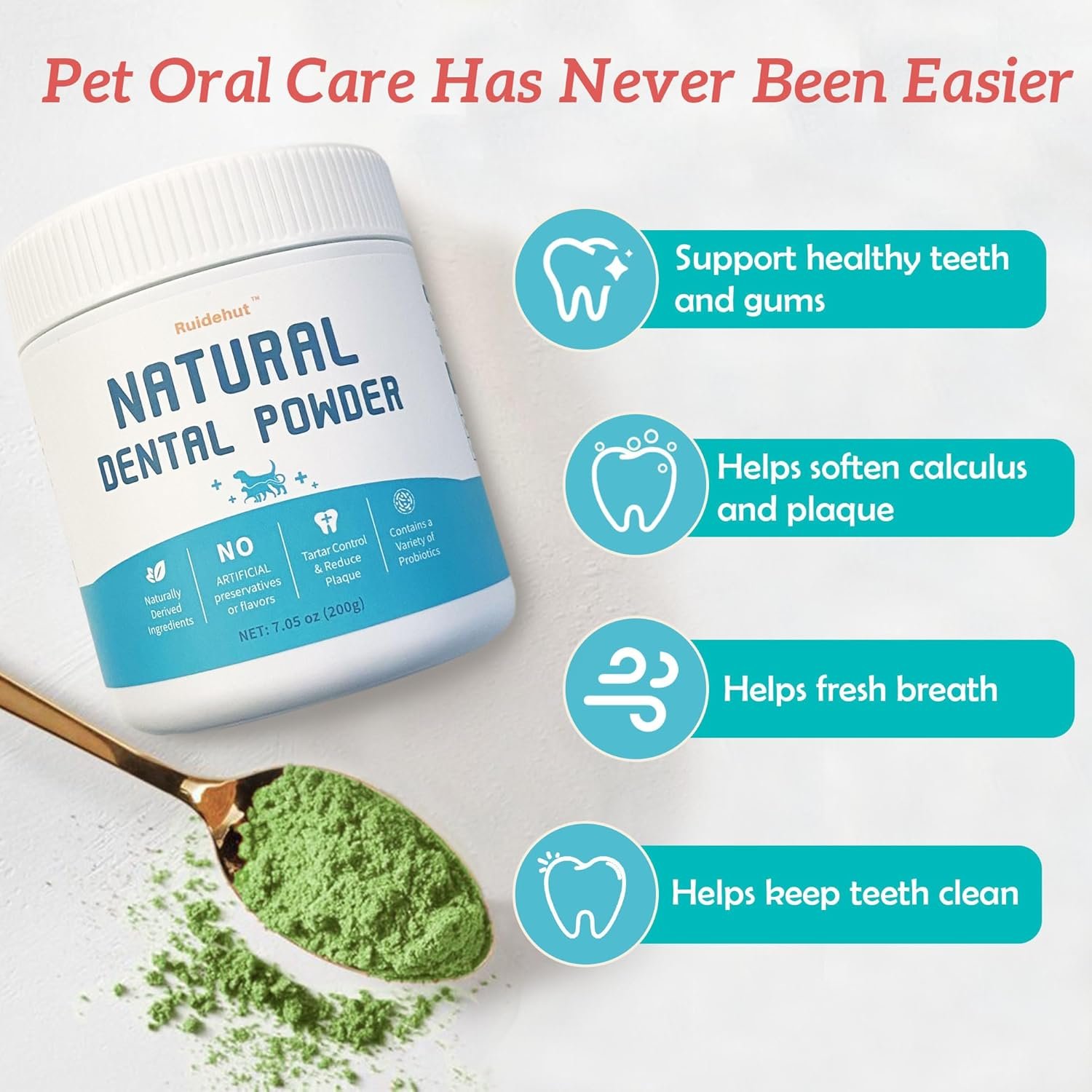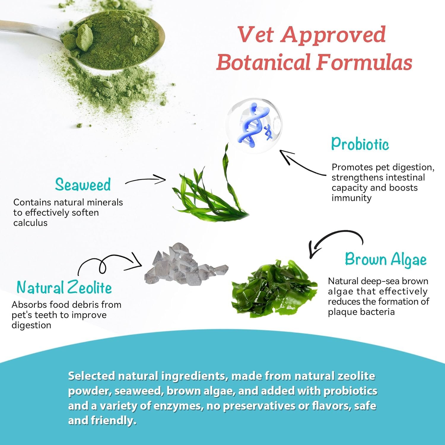 REMOVES PLAQUE & TARTAR: Our dog dental powder contains natural enzymes and zeolite powder particles, which can penetrate deep into the gaps between teeth to soften and remove tartar. The natural active ingredients in seaweed and brown algae are rich in minerals and antioxidants, which can slow down the formation of plaque and promote oral health.