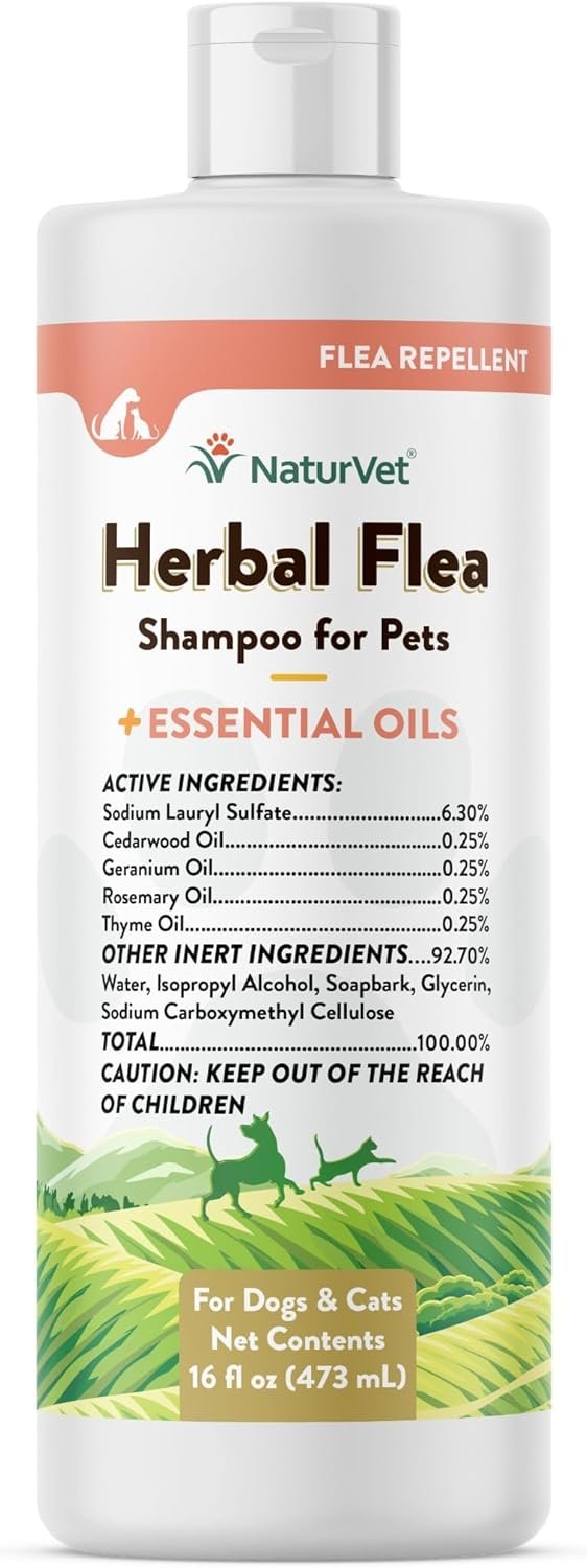 NaturVet Herbal Flea Pet Shampoo with Essential Oils – Helps Against Fleas, Insects – Deodorizing Dog Shampoo – Includes Rosemary, Cedarwood, Geranium, White Thyme Oils – 16 Oz.