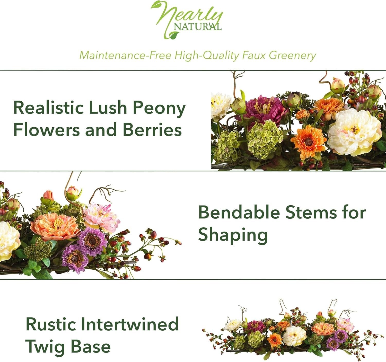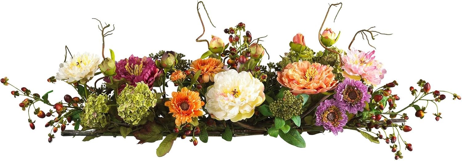 HOME DECOR ACCENT: A beautiful lifelike plant perfect to accent any room or space for year-round greenery. A colorful addition to any room, this dazzling peony arrangement will have you dreaming of a sunny spring day no matter what the season. Plush pastel petals are flanked by a crisp mix of delicate buds and foliage. Nearly three feet in length, it’s the perfect size to complement a dining room table or fireplace mantel. Perched gracefully atop rustic intertwined twigs, you’ll be impressed with its authentic beauty.