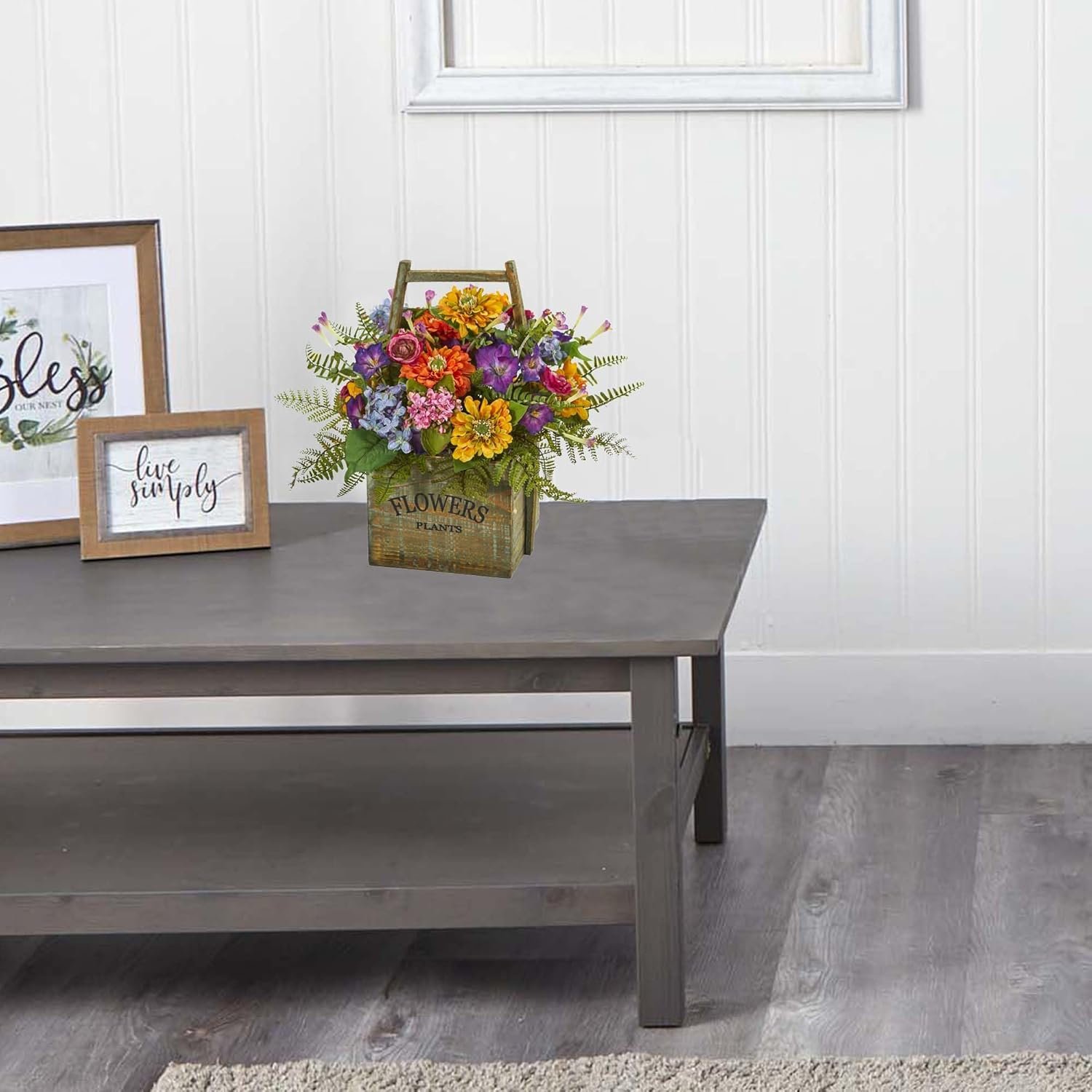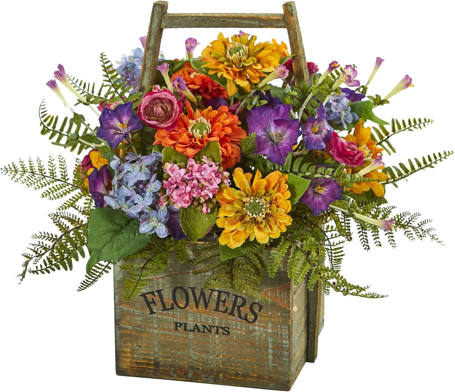 From pink, to blue, orange, and yellow blooms, the artificial mixed floral arrangement will bring the light of spring indoors. Rich green leaves stick out from underneath the dense flower bed, complementing the overall look. With a square flower wood basket included, this 15-inch artificial flower arrangement will make a stunning centerpiece for your window sill or kitchen bar when placed with other artificial greenery.