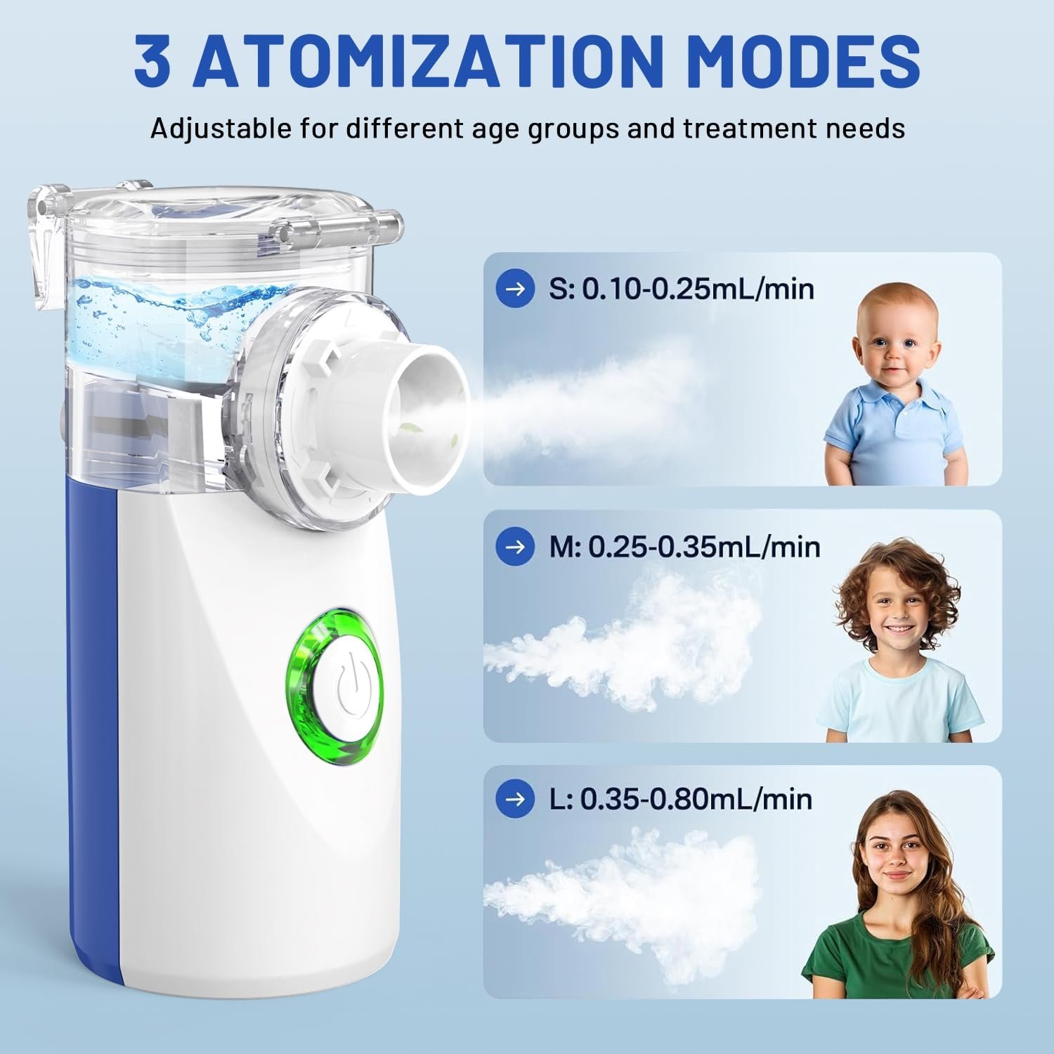 Smart Light & Self Cleaning: Kids nebulizer has 3 lights allow you to easily view the current mode. Also the handheld nebulizer has another special cleaning mode, which can be turned on by long pressing for five seconds, and the lights of three colors are on at the same time. If the nebulizer portable is clogged, you can add warm water and turn on the cleaning mode to effectively prevent the liquid from clogging the nebulizer.
