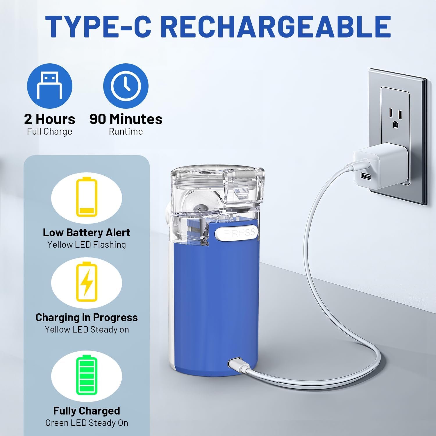 Rechargeable & Long Running Time: Our portable nebulizer for kids has a rechargeable battery installed that is not removable. It is recharged via USB-C and it recharges fast. The fact that it is USB-C is great for traveling because you just need to ensure you have the proper cable then almost any wall wart recharge will provide power. It can work continuously for more than 2.5 hours, allowing you to stay away from the troubles of frequent charging.