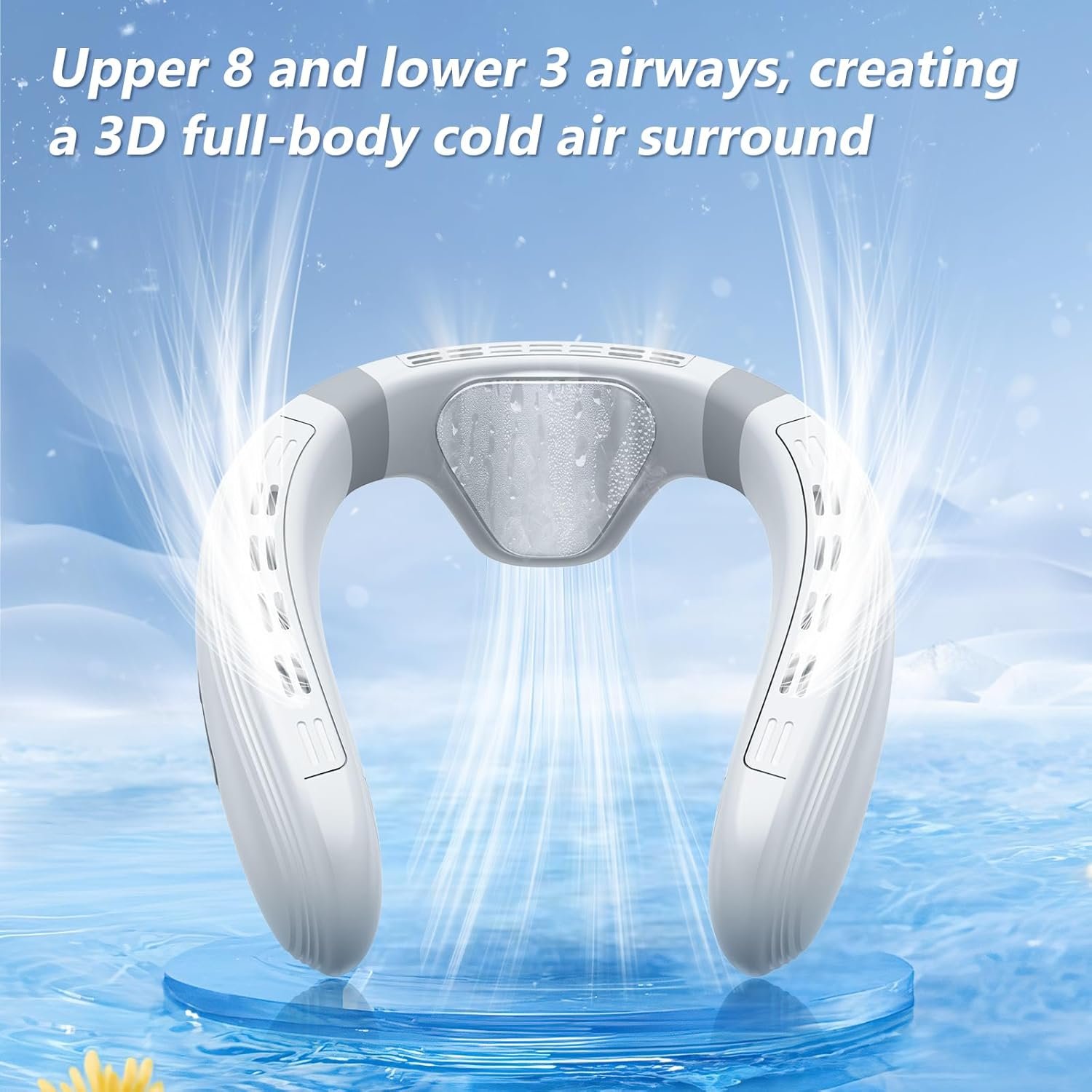 [3D Powerful Airflow] The neck fan is equipped with 4 turbo-supercharged engine, which dramatically increases the airflow and cooling effect. The all-new high-speed rotating fan adds a flat air passage specifically for cooling the back, enhancing back cooling airflow, preventing back sweating. The upper 8 and lower 3 airways form a convection system, creating a 3D full-body cold air surround.