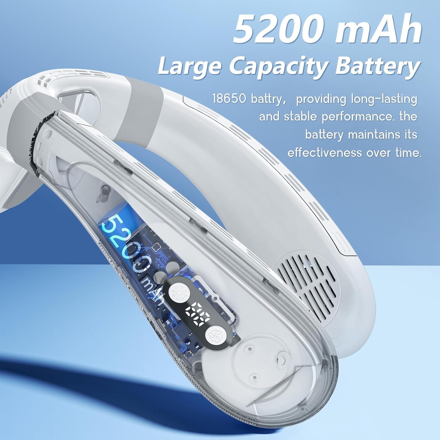 [Long-lasting Battery]The personal neck fan that blow cold air comes with a powerful 5200mAh rechargeable battery that offers a long-lasting cooling effect for 3-12 hours. This makes it perfect for extended outdoor use or for all-day wear. The 5V 2A USB-C fast charging port let the charging time is shortened, and you can use it while charging. With its long-lasting battery and fast charging capability, you can enjoy a cooling breeze wherever you are, making it an essential companion for hot days and outdoor activities.
