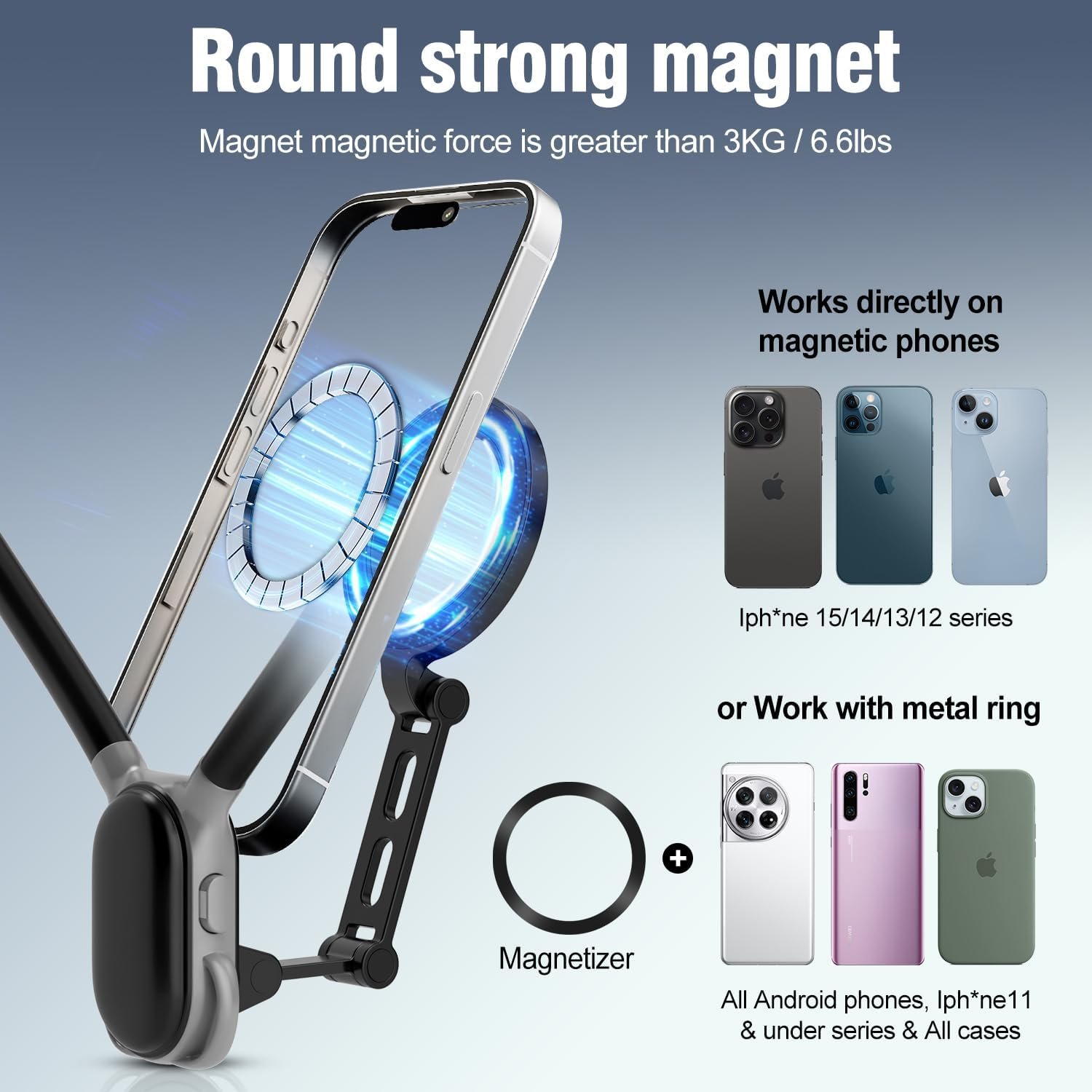 【Strong Magnetic Force and Compatibility】 With 16 powerful magnetic aluminum magnets, our neck tripod provides a secure and stable grip for your phone. Neck mount comes with a magnetic ring, ensuring compatibility with magnetic phones such as the iPhone 15, 14, 13, 12 series, and non-magnetic Android phones like Samsung Galaxy, LG, Motorola Moto, Google Pixel, and others. This phone chest mount offers convenience regardless of your phone brand.