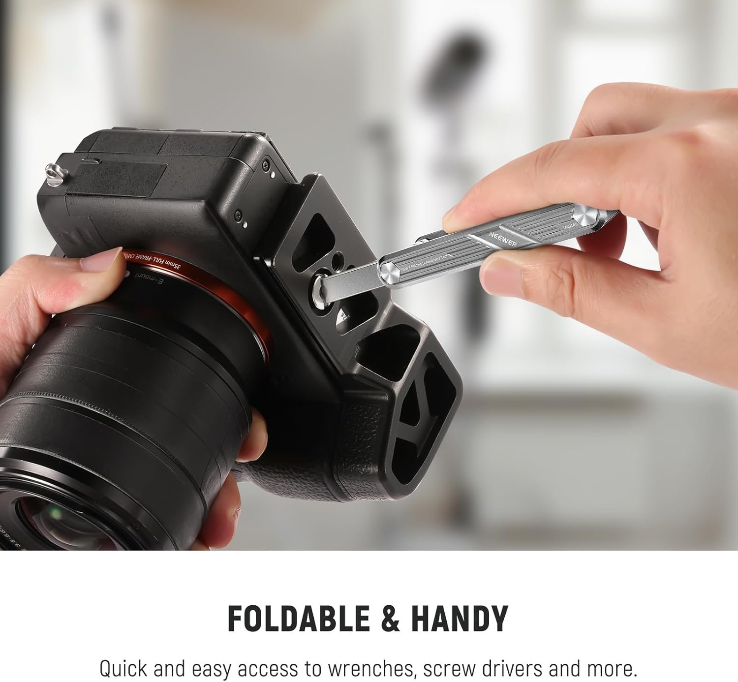 Versatile 10-in-1 camera tool set: with this indispensable 10-in-1 folding tool set with 6 types of Allen keys (2.0, 2.5, 3, 4, 5, 3/16) and 4 screwdrivers (Torx T25, Phillips, SL7 and slotted), you are always equipped for minor repairs. Ideal for tightening and loosening screws and performing DIY repairs to camera cages, phone cages, top handles, side handles, tripod heads or quick release plates