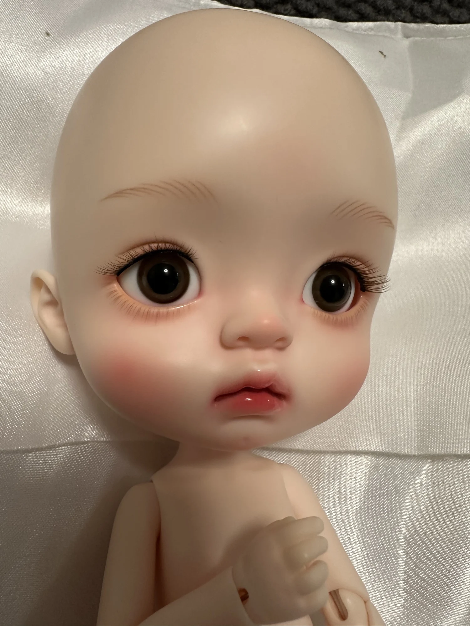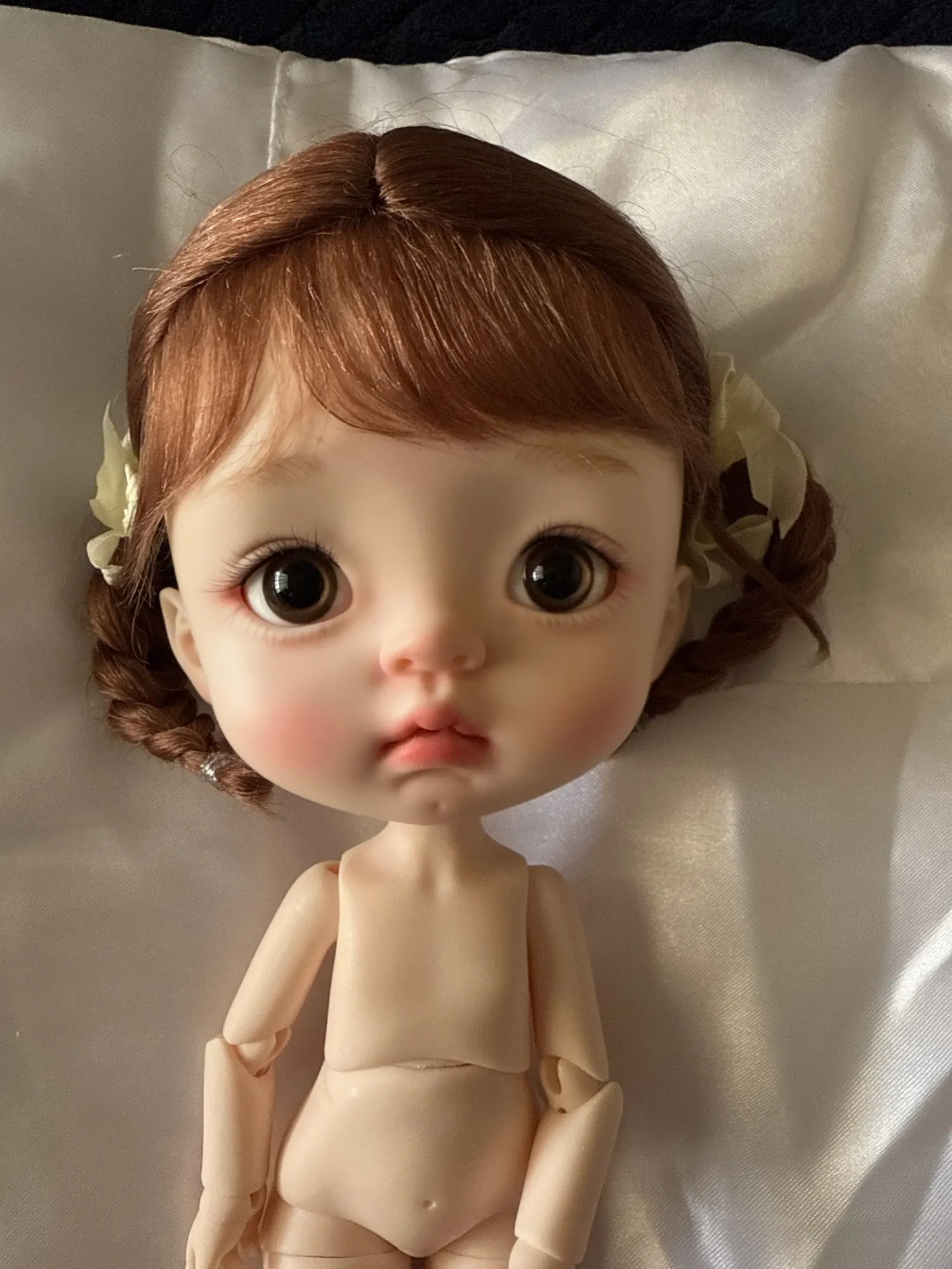 The makeup is delicate and perfect. She has makeup on even her little ears and her precious brown eyes (as I requested if they could send them to me in that color) framed with cute eyelashes.