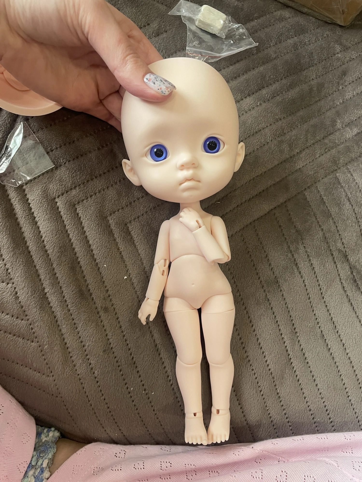 This time I ordered a doll without makeup. And strangely enough, the fit is better this time. The doll comes in a box wrapped in a blanket. The set includes a cleaning sponge, eyelashes, and eyes.