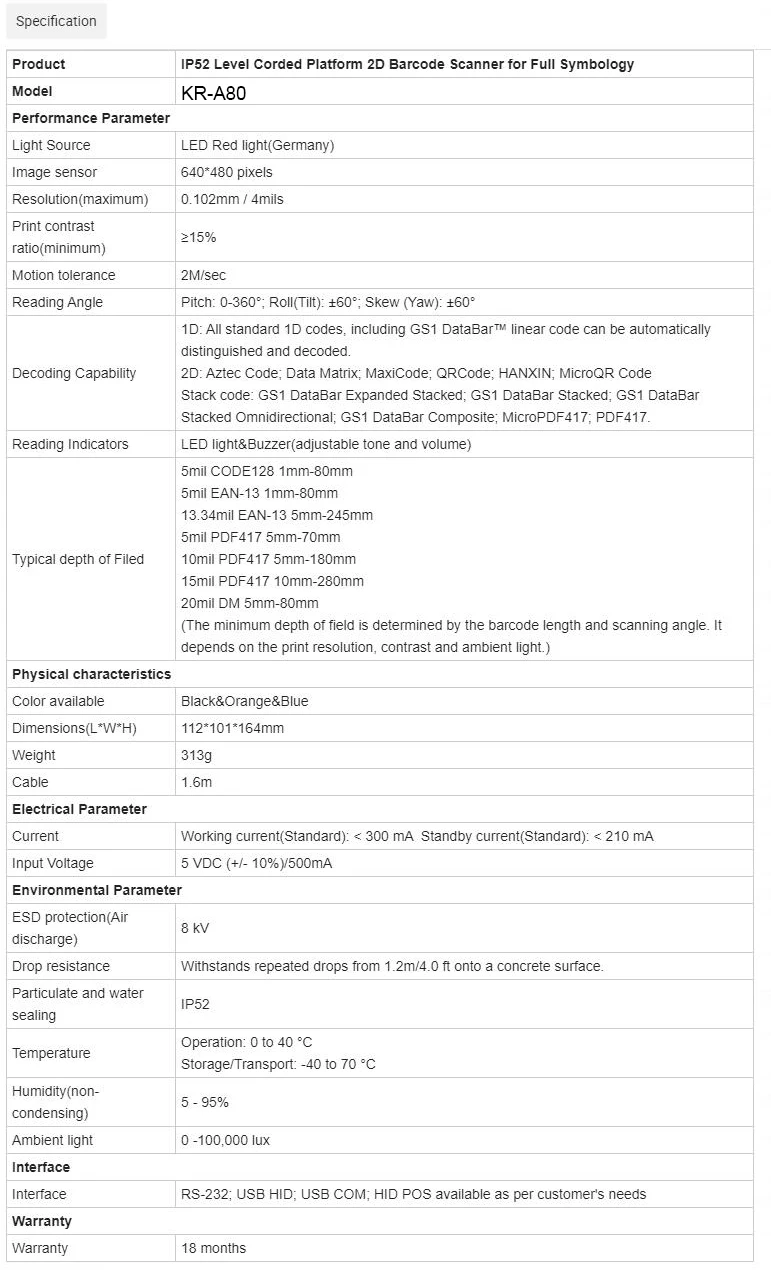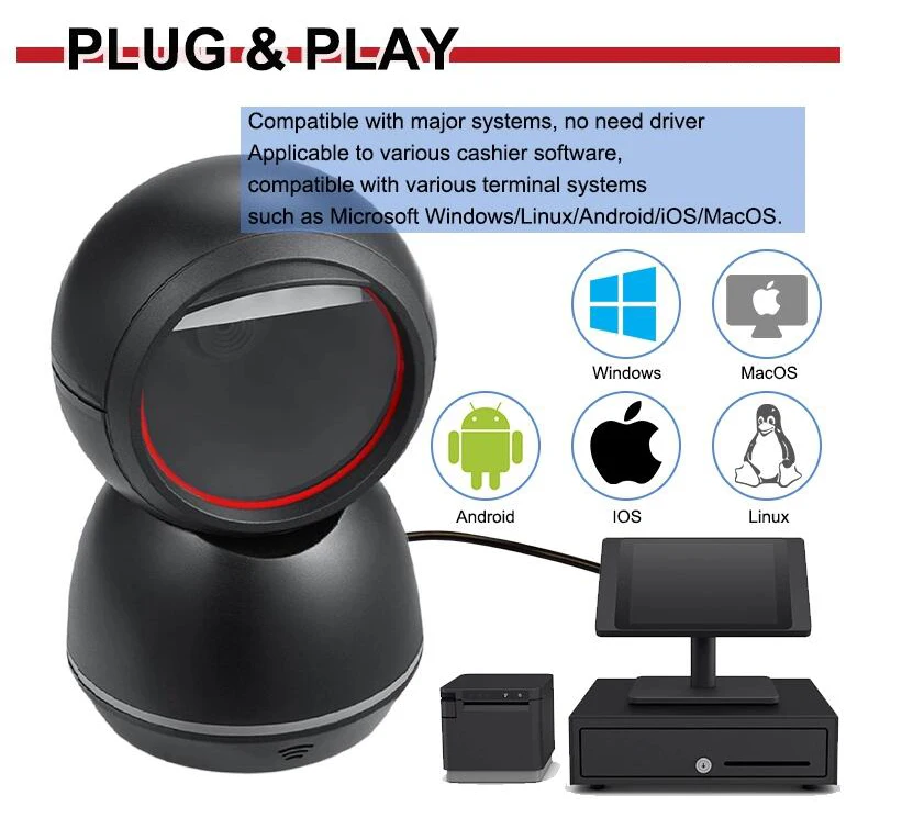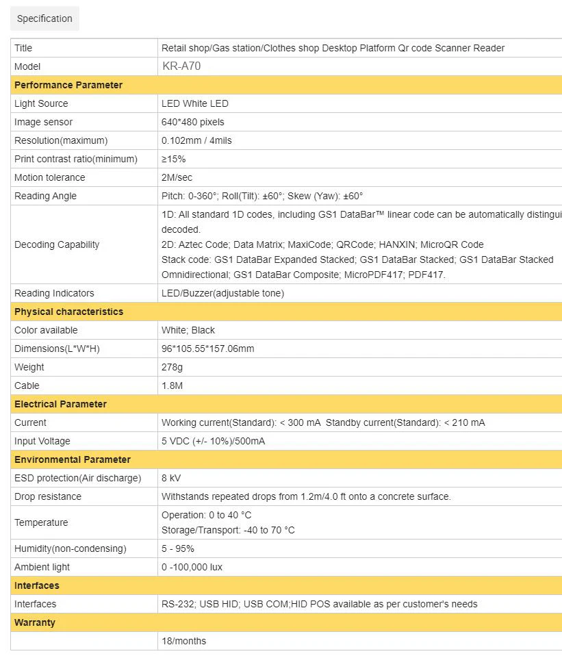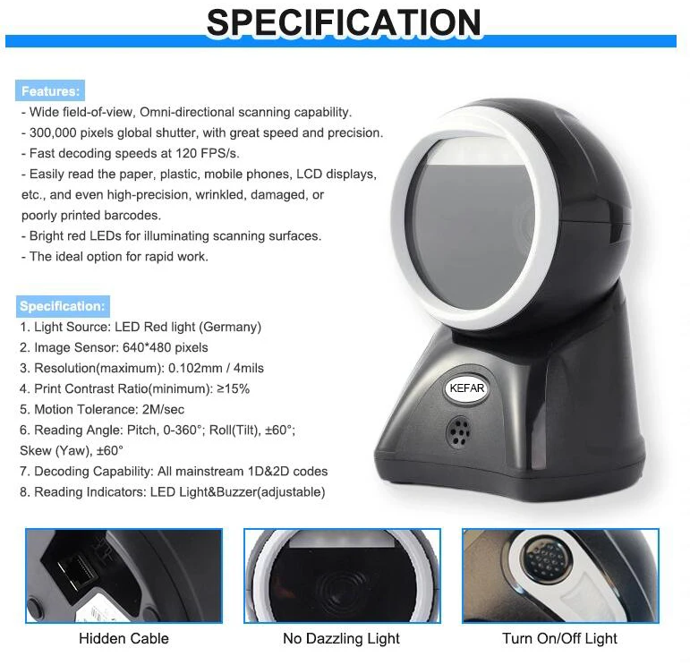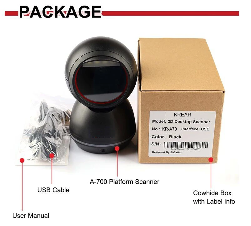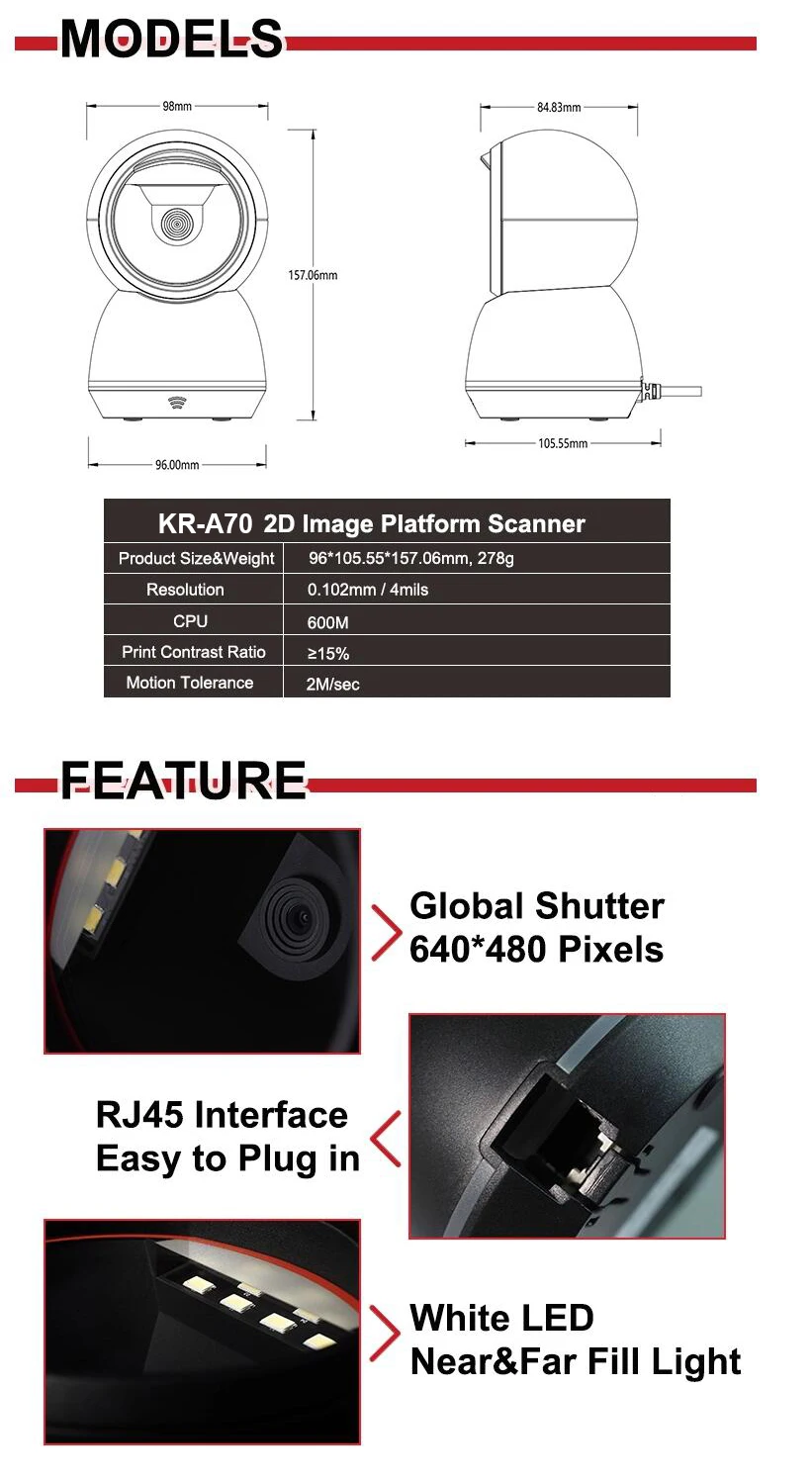 Model 2: KR-A70 Wired omnidirectional Desktop Platform Barcode Scanner 1D 2D QR Bar Code Reader with Auto Scanning for Supermarket Cash Register