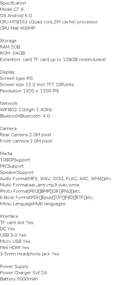 New Arrival 12.2 INCH RAM 2GB ROM 64GB CT9 Android 6.0 Tablet PC MT8163 Quad Core 1920 x 1200 IPS Screen Dual Camera USB 3.0