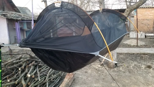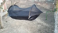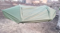 Fast delivery. Packed in bubbles. A good compact single-person hammock tent. In the summer, it’s perfect for sleeping or relaxing. Sealed seams on the awning. Everything is compactly packed. It is single-layer and in the tent version, you should take care of the condenser; oh, keep the entrance open. to have ventilation. The width for the footprint is about 90 cm in the tent version.