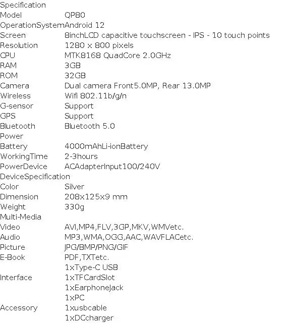 New QP80 Type-C 8″ Android 12 Tablet 3GB RAM 32GB ROM MTK8168 Quad Core Dual Camera 1280 x 800 Pixels WIFI Bluetooth 5.0 GPS