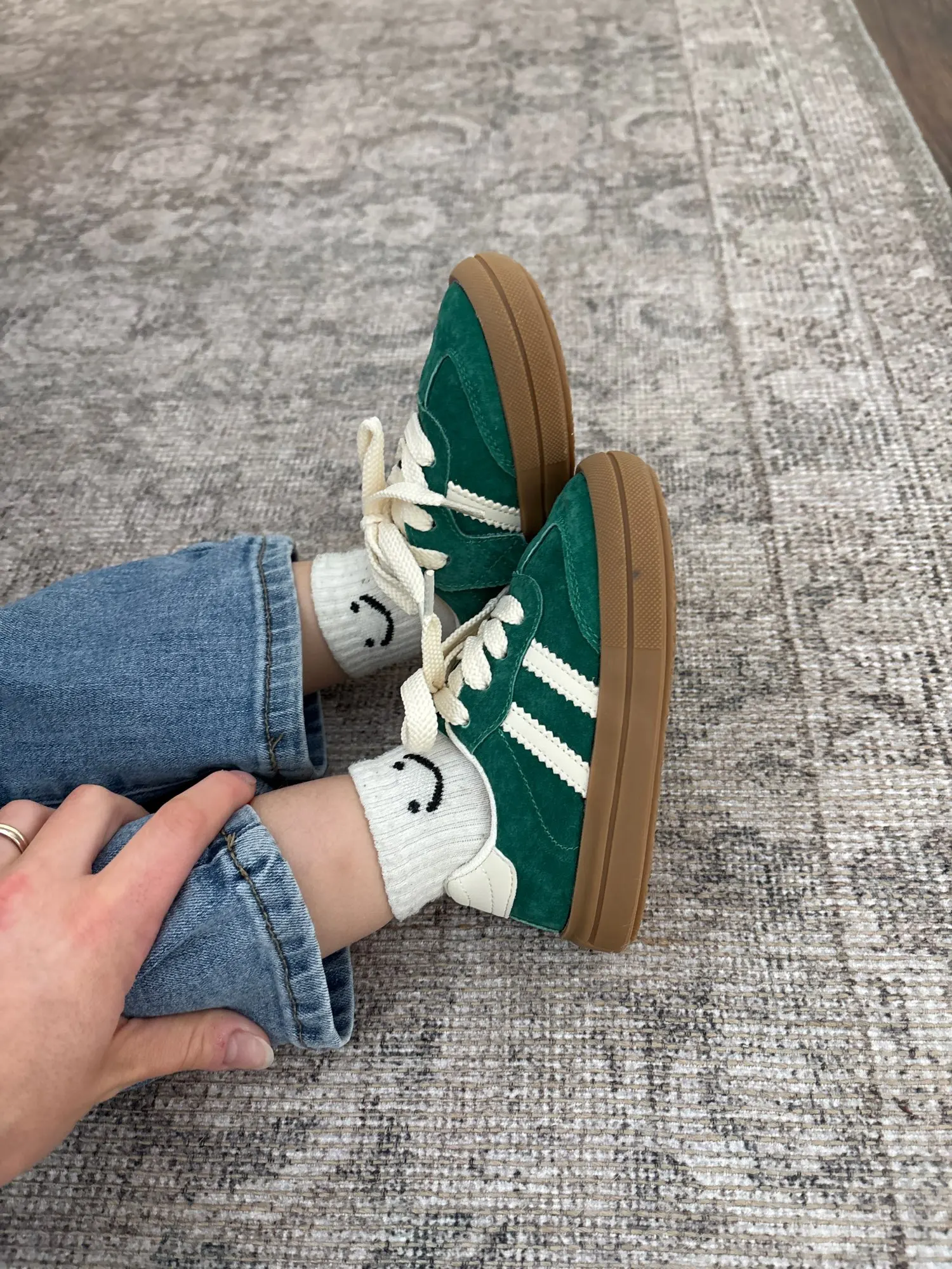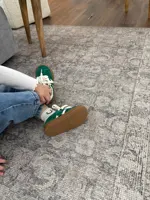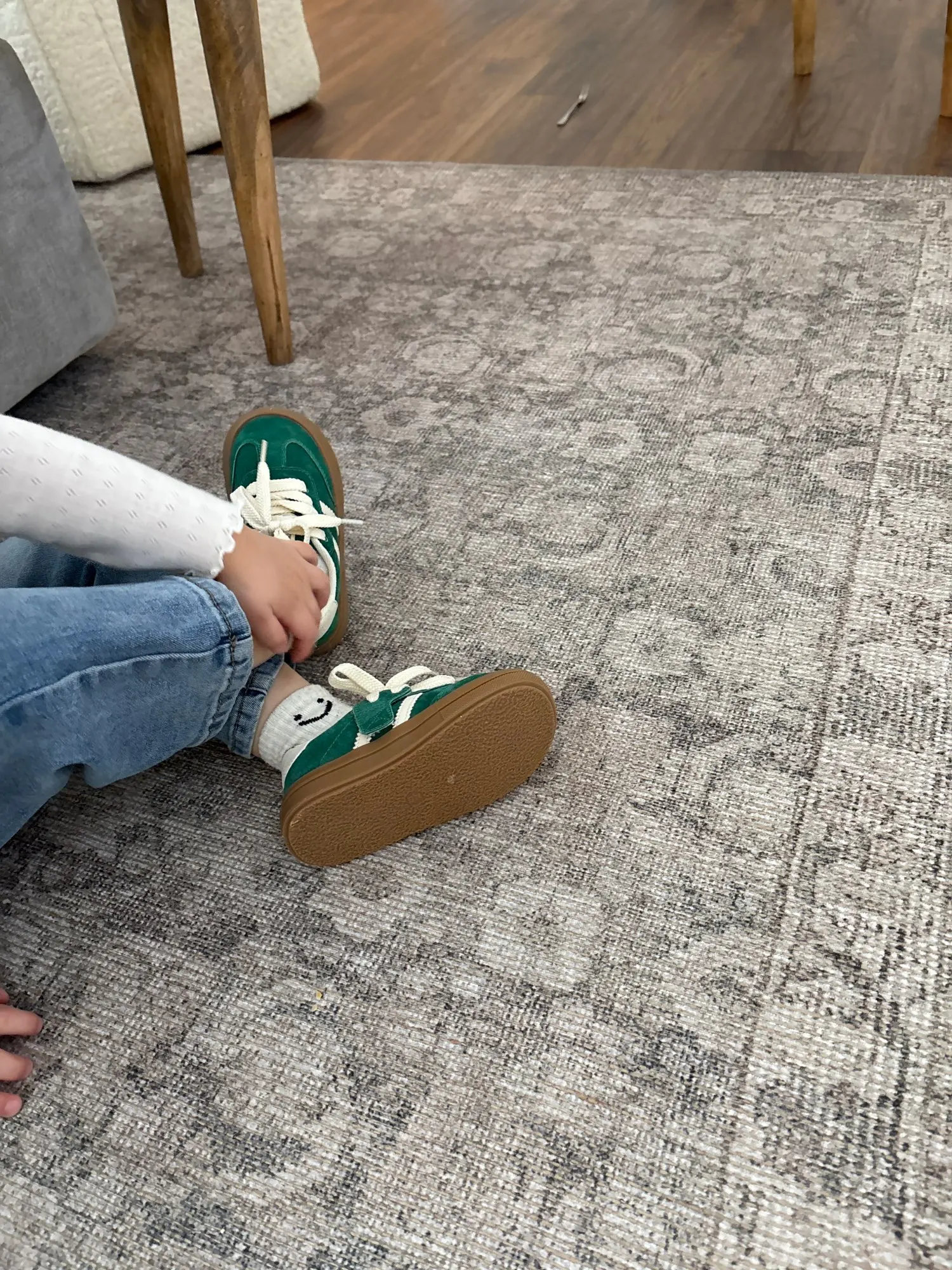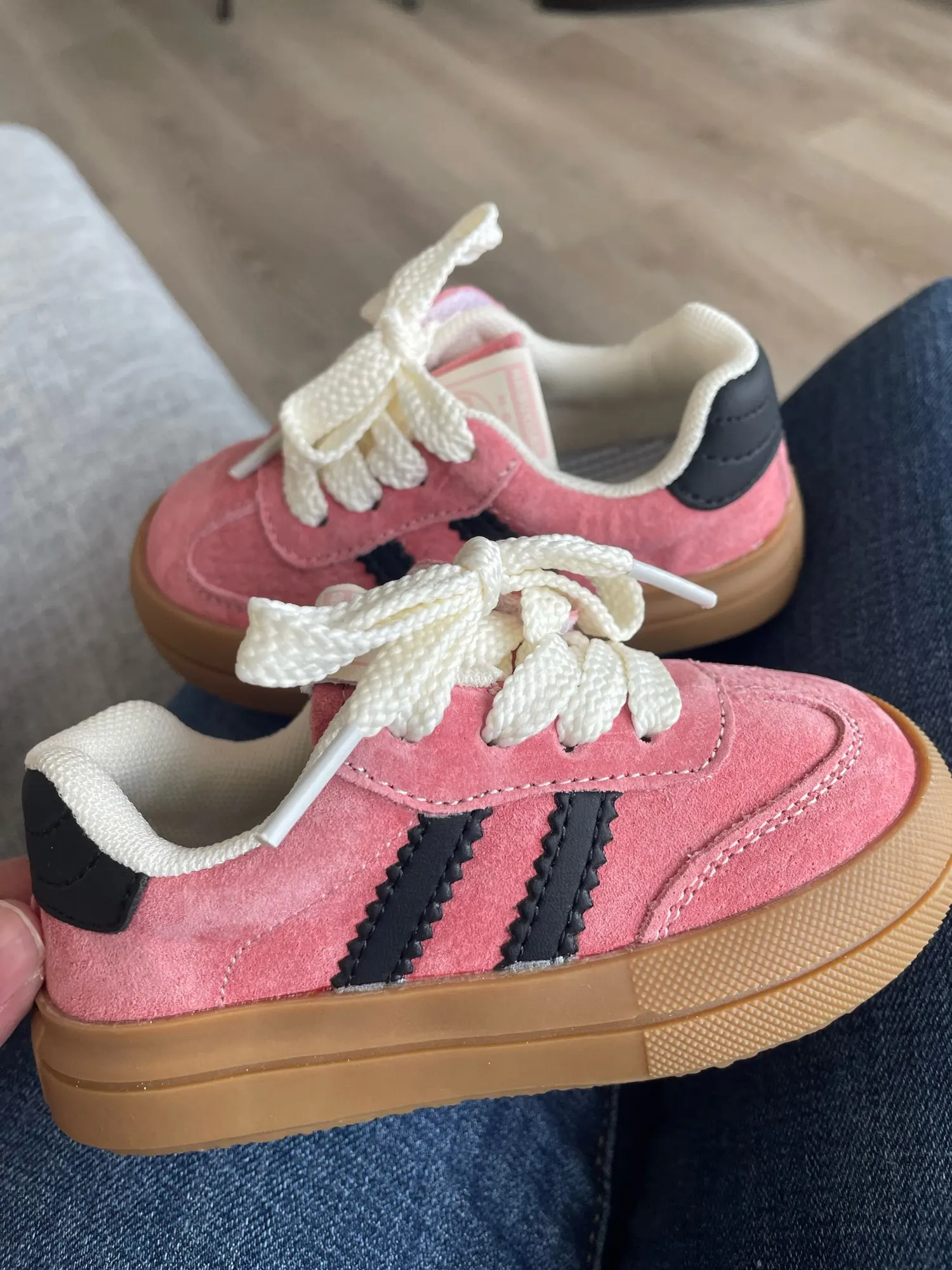 True to size and very cute on. I love how they have the velcro & real laces! Bought in yellow and green and think i need to purchase the pink now too!