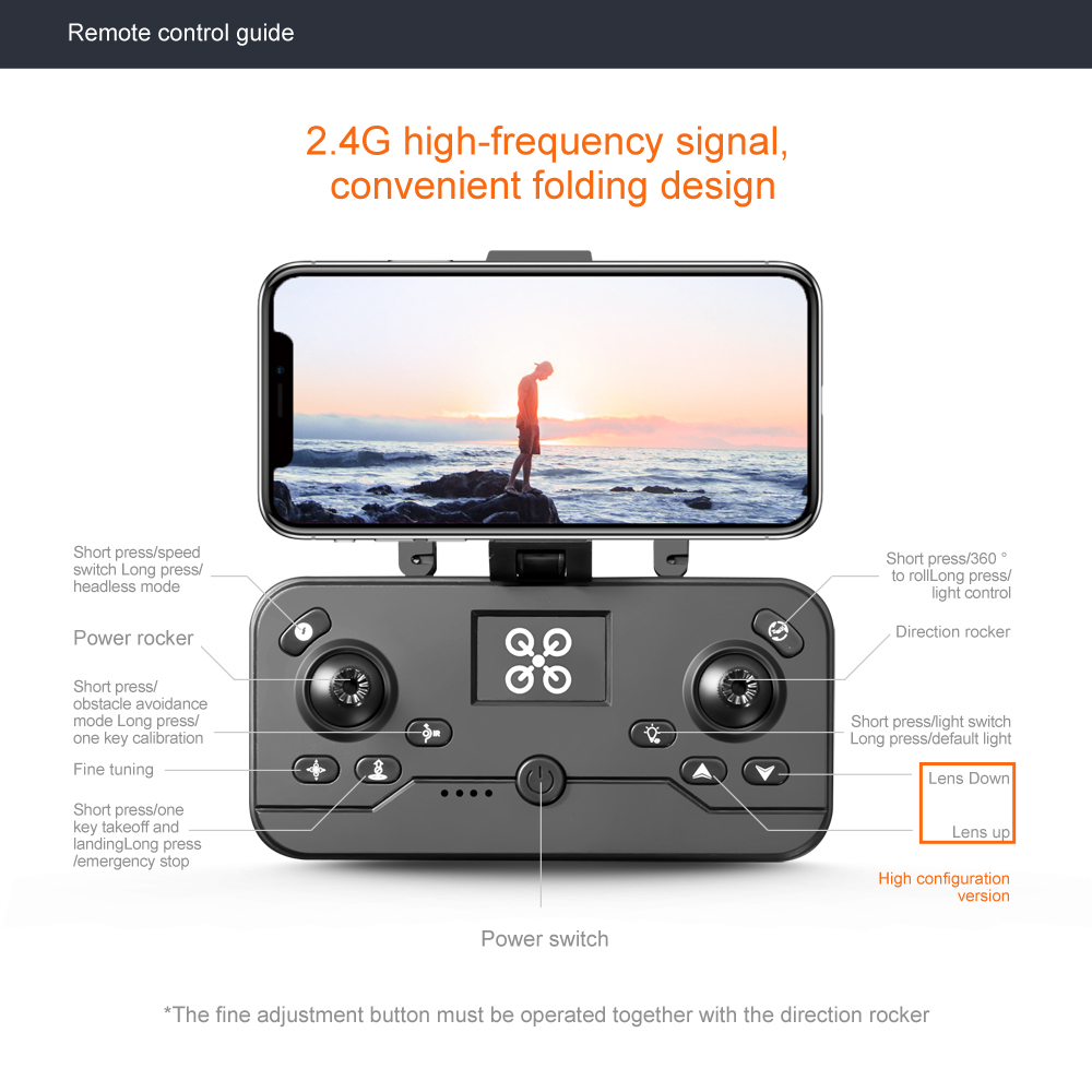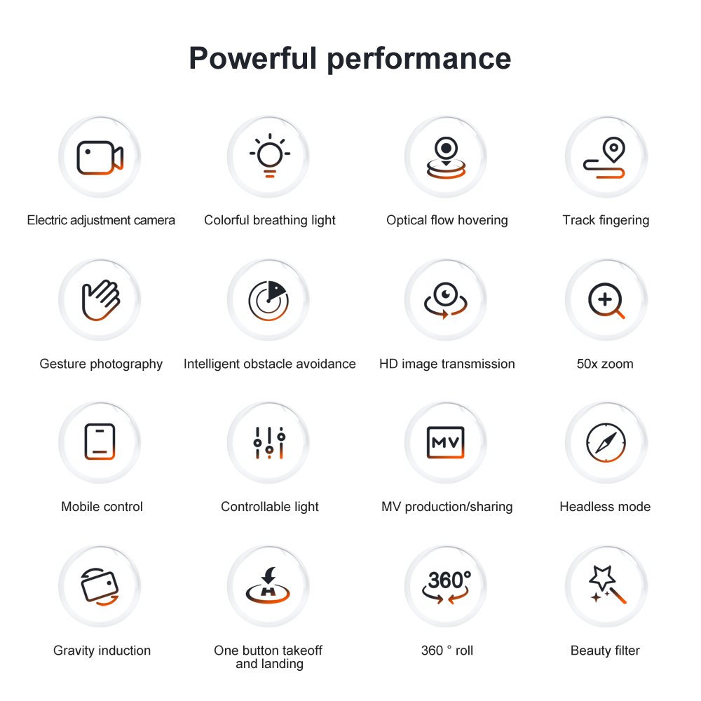 Camera function: four way obstacle avoidance. Light control. Light change color switch 72 kinds. Fixed height function.360° roll. Aircraft foldable. Six pass band gyroscope. One key calibration. One key take-off. One touch down. Up and down. Forward, back. Side to side. Steering. Headless mode. Fuselage light/headlight. Gesture to take pictures. Video. Headless mode. Emergency stop. Trajectory flight. Gravity sensing. Music. 50x zoom. Automatic photography. Optical flow positioning. The camera can be controlled by electric control