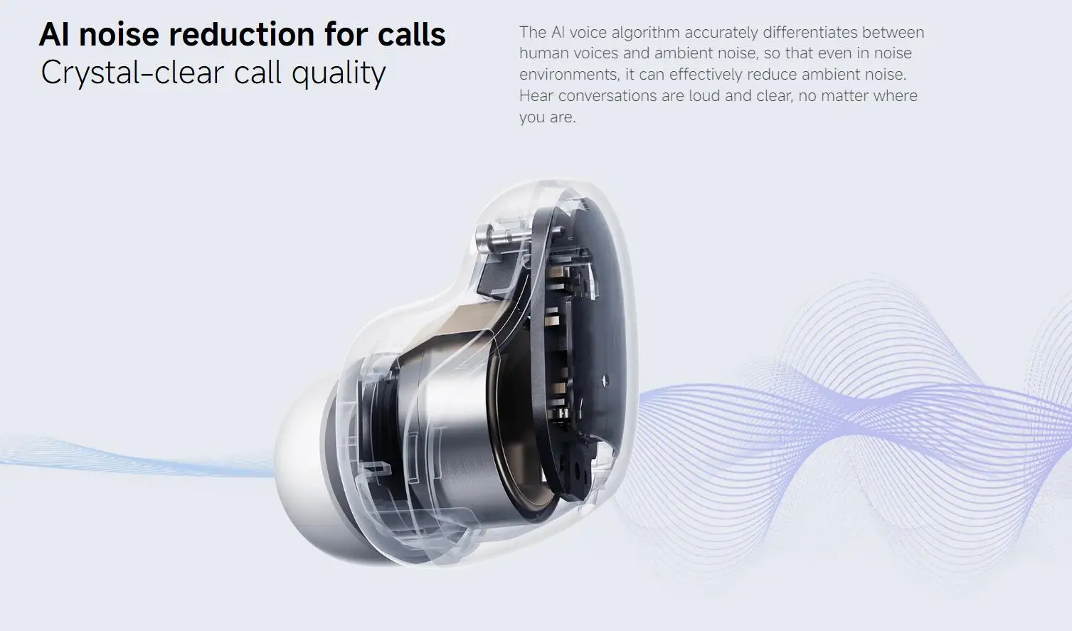 The AI voice algorithm accurately differentiates between human voices and ambient noise, so that even in noise environments, it can effectively reduce ambient noise. Hear conversations are loud and clear, no matter where you are.