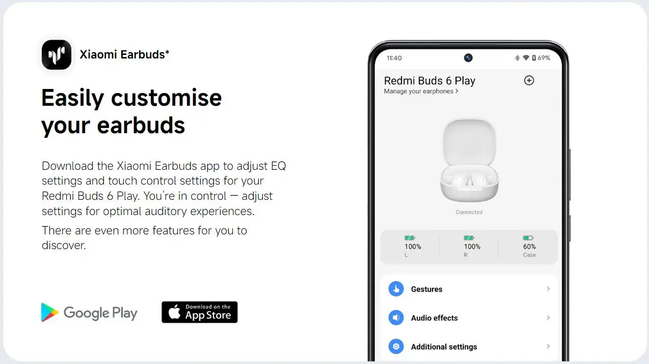 Download the Xiaomi Earbuds app to adjust EQ settings and touch control settings for your Redmi Buds 6 Play. You’re in control — adjust settings for optimal auditory experiences.