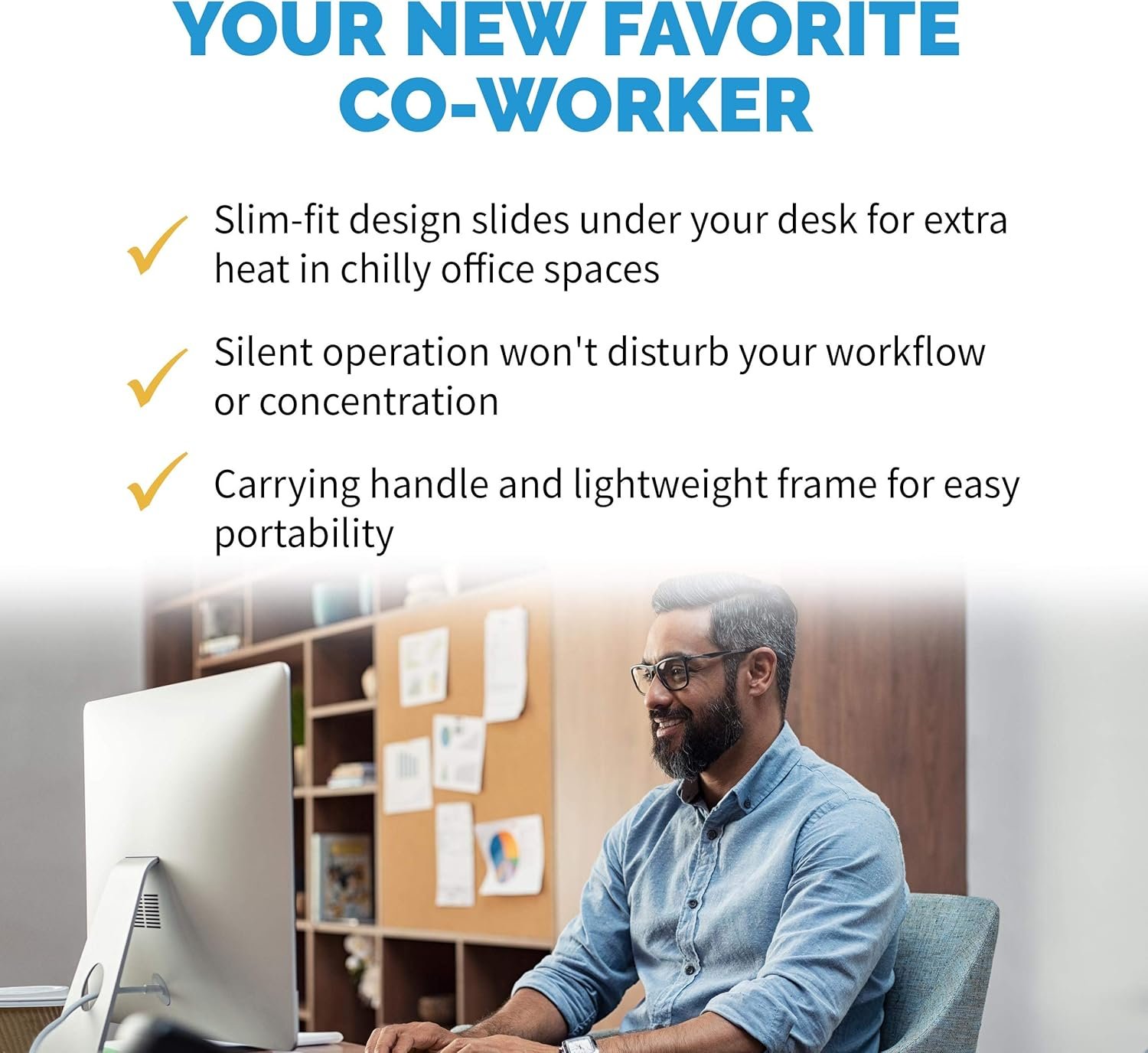 The portable under desk heater is your new favorite coworker. This compact electric heater delivers warmth while you work. Place its slim design against the back wall of any under desk area to maximize space for your precious leg room. Don’t worry about disrupting your concentration or your teammates-it is completely silent. It also comes with a tip-over kill switch and overheating protection for peace of mind.