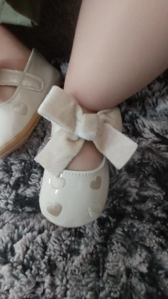 They are very pretty, patent leather and heart details, the bow is velvet and they look very cute, I love them. Thank you