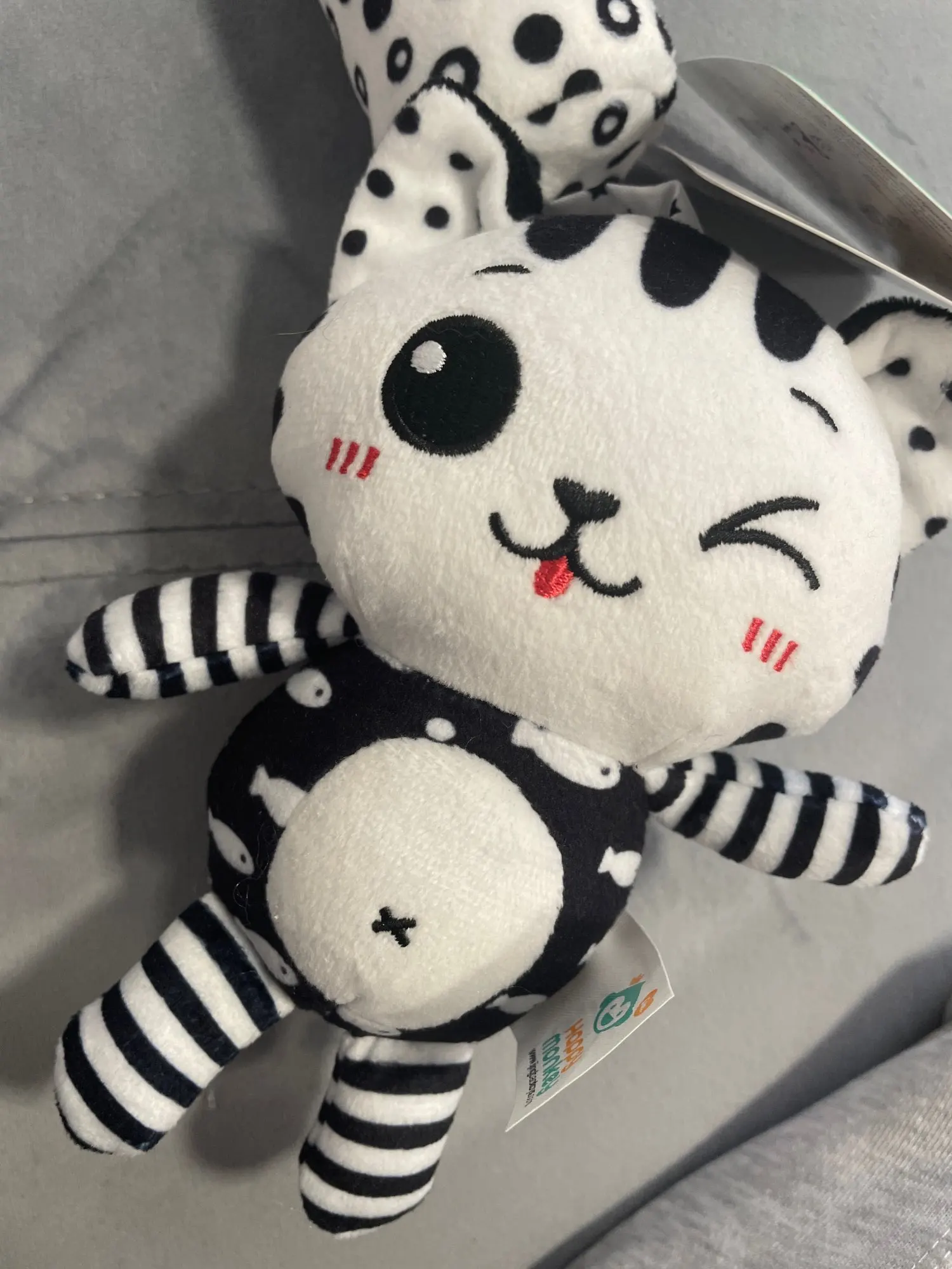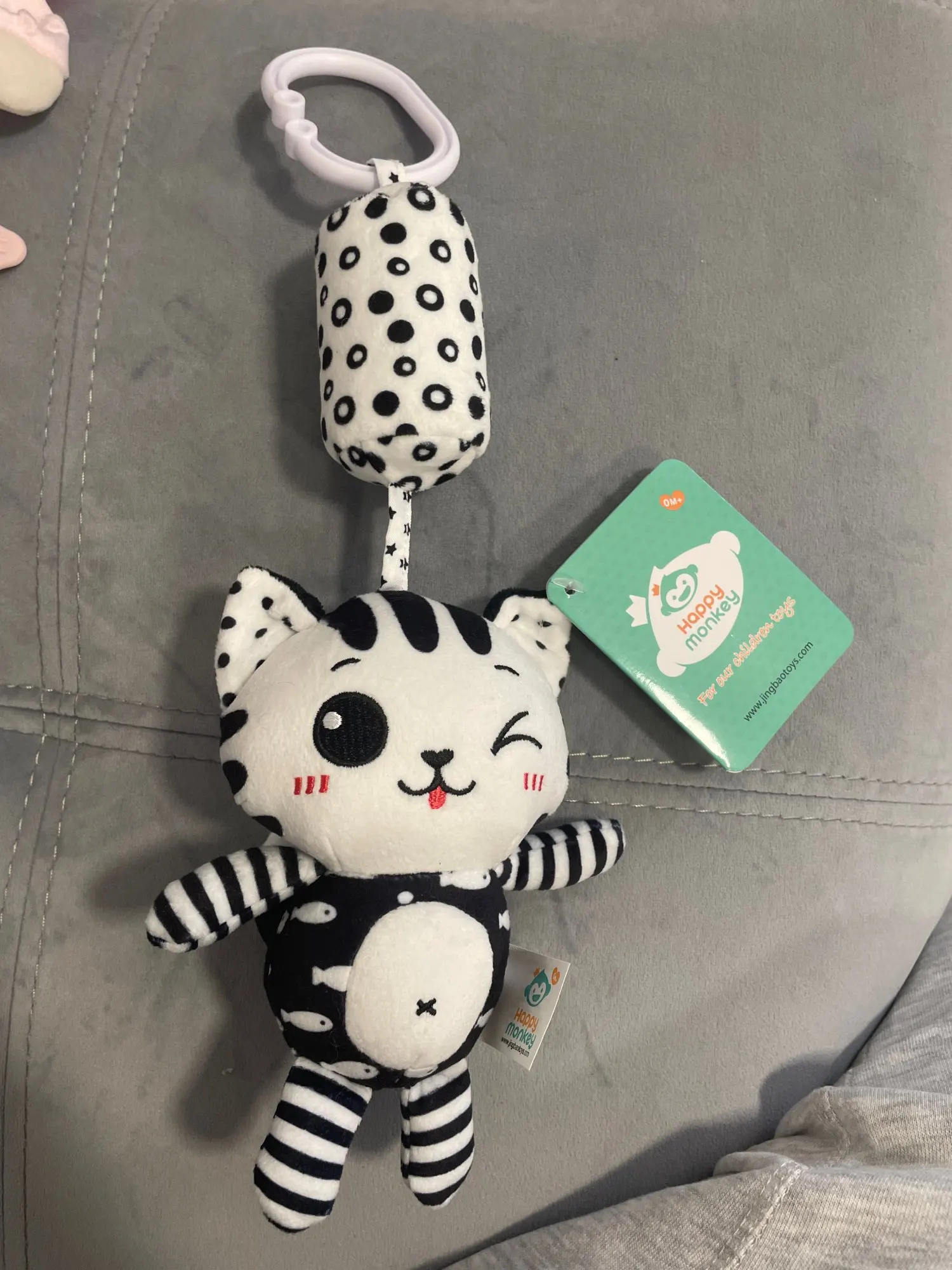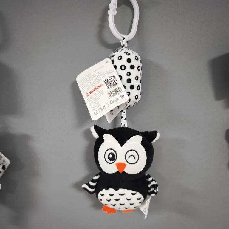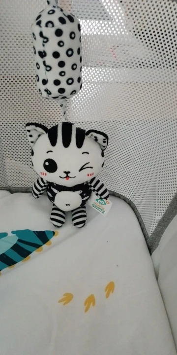 Super! The cat has crinkly ears and a squeaker in its belly. We hung it above the crib – the baby got interested. Satisfied with the purchase.