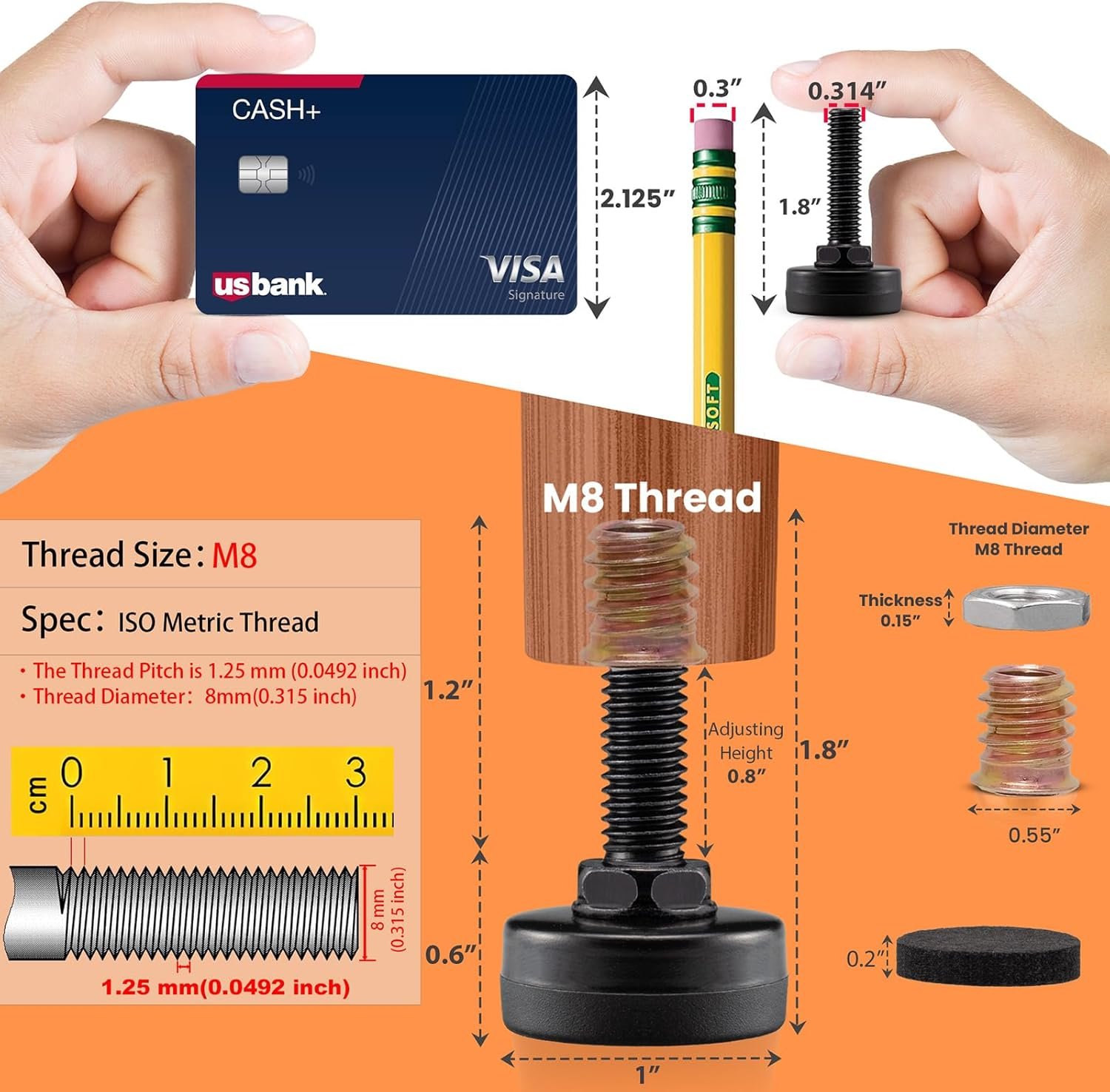 ✅【M8 Thread Furniture Levelers】❗❗❗Ensure furniture compatibility by measuring for the right leveling feet size in metric units. For M8x1.25mm threaded legs, easily adjust by screwing in the leveler. For non-threaded legs, simply pre-drill a hole for a tight, secure leveler fit.